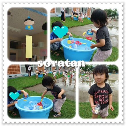 1歳11か月と24日目今日はどんよりで、、ムシムシママも疲れぎみでどんよりだけど、、保育園へGO体育館の中はすごい人どうやら、、上の子が休みで一緒に連れて来てる様子。。。暑いーーーそして、、短冊を作っていたので、、soratanと一緒に作成ママと一緒にはさみで☆を切って貼ったり、、顔を書いたりそういえば、、こっちは8月7日が七夕だもんねぇ。。忘れてたわっ今日も園庭解放していたので、、さっそく水遊び足を付けないと楽しいらしく、、30分以上ももくもくと遊んでたぁでも、、、、、、前にいる男の子に思いっきり水かけちゃってアチャ濡れても良い状態なら、、って感じだけど、、洋服着てるしねママ、、びっくりしちゃって、、「ダメよ」ってすんごい怒っちゃったら、、固まって、、遊ばなくなっちゃった。。怒り過ぎたぁ。。。。ゴメン隣では、、園児達が、、パンツ1枚で本気で泥まみれで水鉄砲とかで遊んでるしね。。やりたいよね。。。水遊びをやるなら、、洋服着ては中途半端でちょっと可哀想だなぁ。。それでも、、満足したようで、、「水遊び楽しいねぇ」って言ってたから良かったぁそして、、、、お昼を食べた後は、、ママの皮膚科に薬を取りに急いで行ったのに、、何と2時間もお昼休みがあるみたいで、、1時間待ちあーーー。。どうやって、、時間を潰そうか。。。。ブラブラしてると、、食べたばかりなのに、、「パン食べる」と暴れ出したから、、お座りして食べようねとベンチで座って食べてたのに、、、「ヤダーーーー」と言って、、歩きだし。。。。人がたくさんいて危ないのに、、立ち食い開始何度連れ戻しても言う事を聞かないので、、抱っこでダッシュ丁度、、工事現場があって、、しばしご機嫌に観察してくれて、、工事しててくれて、、、良かったーーーーーーーーーーーーーーー病院では、、ブーブで暫く遊んでてくれたから、、何とか助かったぁーーー最近、、また、、自己主張が強くなってきて、、ばぁばもギブするようになってきちゃったし引っ越し準備もあるから、、体力が持ちましぇん。。。。。。トホホ