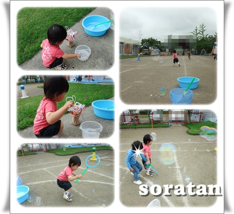 1歳11か月と19日目今日はお天気もイマイチ雨降りそう急いで準備して、、保育園へ1番乗りだった誰もいないねーー。。すると、、園庭から先生がsoratanを呼んでるまだ、、雨降ってないし、、暖かいから、、おいでぇーーしゃぼん玉がたくさーーーーーーーーん他の子もたくさん来て、、みんなで大騒ぎsoratanも大きい輪を作ったり、、自分で吹いたりしてた地味に、、しゃぼん玉って初めてかもーーーーーーーーしかも、、うちわの紙を取ったやつは、、めちゃめちゃたくさんできて、、ママも大興奮soratanは、、何だこれと言って、、触るの怖がってたけど、、後半は触ったら消える事がおもしろくて、、追っかけて汗だく久々に、、ママ友さん達もたくさん来てて、、ママもおしゃべり出来て楽しかったぁこの興奮のせいか、、中に入っても落ち着かなく。。。最後の手遊び歌は、、一度もやらず、、一人でひたすら体育館を走りまわってたこの間、、成長と思ってたのは、、眠かっただけだったのね(笑)前回作った、、魚くんも飾られてたぁーーーアンパンマンの人形劇、、みんなちゃんと座って見てるのに、、一人で興奮して、、うろちょろしてる人アチャしゃぼん玉は、、食器用の洗剤とせんたく糊とお水で簡単に出来るみたいなので、、今度作ってみよーっとそして、、、今日は、、ママの大好きな花火大会夜、、雨降りそうなんだけどどうか、、降りませんように。。
