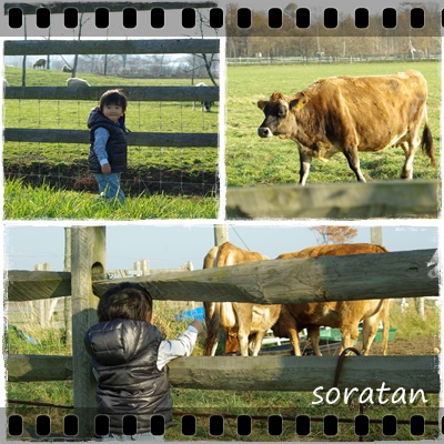 2歳3ヶ月と2日目今日は、、久々にポカポカ天気なので、、パパの仕事帰りを待ち、、午後からだけど、、前から気になっていた、、「えこりん村」へGOでも、、メインの村?みたいな所。。動物もたくさんいて、、意外と楽しいと聞いていた庭園だけが、、10月末でクローズえーーーーーせっかく天気がいいのにーー。。こんな天気最後かもしれないのに。。クスン。。ショック仕方がないので、、その辺にいた、、羊やヤギや牛を見て、、ほのぼの~すると、、soratanが、、「動物怖いの、、頭が○○ちゃんのお腹にごっちんこしたの」って説明し出し、、、2ヶ月くらい前に、、動物園で、、ヤギにお腹をド突かれたのを覚えてるんだーーやっぱり、、トラウマになってたらしい。。。アチャチャ。。。大丈夫だよと必至に説得し(笑)他の子供達が草を牛にあげてるのを見て、、soratanもあげると言い出し、、「牛さん~こっち来てよー。。草食べてよー」と何度も叫んでる。。カワイイ。。すると。。。突然、、こっちに歩いて来て、、めっちゃ近いーーーーーーーーーー慌てて、、ママは助けに行ったわ食べさせるって、、結構、、怖かったっ(笑)そんなこんなで、、牧場を見に行った?って感じだったけど、、「牛さんたくさん食べるんだよー」って帰って来たから、、動物克服できたかなsoratanにはこういうのでも楽しいのかもね。。