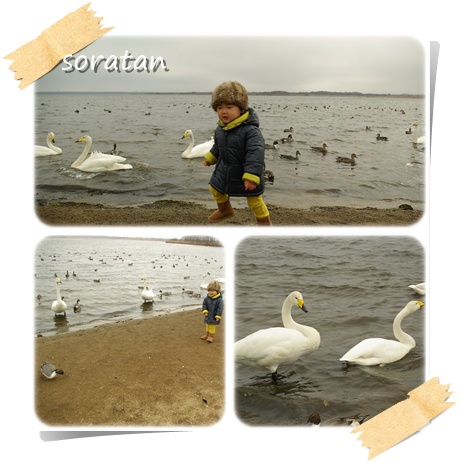2歳3ヶ月と3日目今日も暖かいという事で、、白鳥を見に行こうかと急に思い立ちウトナイ湖までGOもう、、何年ぶりだろう。。若い頃来たなぁーーー。。懐かしいsoratanは車の中で「白鳥さん、白鳥さんの動物見るんだよー」と何度も言って大はしゃぎしかも、、ママ頑張って、、お弁当も作っちゃったもんねー。。でも、、、高速に乗ってると、、だんだん曇って、、霧雨まで、、アチャ到着すると、、めちゃめちゃ寒いキャー。。しかも、、やっぱり、、「怖いのーーーーーーー白鳥の動物、、怖いのーって半べそ」たくさんいるし、、人に慣れてて、、近寄って来るのよねー。。フフ。。「帰るっ」って言いだしたから、、慌てて、、餌を買いに行き、、「白鳥さんにご飯あげようか」って言うと、、突然、、袋から餌を奪い取り、、すんごい近くまであげに行ったぁしかも、、夢中になり過ぎて、、湖の中まで入っちゃって、、ベチャベチャ~キャー。。寒いし、、ヒドイ事になってきたので、、急いで退散soratanは、お弁当を食べながら、、「白鳥さんもご飯食べたね」と満足気だったので、、ヨ。。ヨカッタ。。しかも「ママ。。お弁当作ったの?ありがとう」だって「ママのお弁当美味しいよね」だってーーーーー(号泣)ホントに涙出そうだった。。嬉しい。。もっと作らねば(笑)そして、、帰り道に、、空港を通ったので、、飛行機を見に行く事に空港に用事もないのに、、来るのって初めてかもーーもちろんsoratanは大はしゃぎ2月にグアムに行った時に飛行機乗ったのに、、あの頃は無反応だったもんねー。。生で見るのは、、相当嬉しかったらしく、、目をキラキラさせながら、、真剣に見てたこんな姿を見ると、、来て良かったぁー。。もっとたくさんの本物を見せてあげたいって思っちゃう地味に、、ママもパパも展望台は初めてだから、、興奮しちゃったぁーーすごい迫力だわっ花畑牧場のホットキャラメルかけアイスを食べたり、、空港もいろいろ楽しめて、、いいかもーCSとかでブラブラするなら、、空港の方がいいねって、、新発見だったっ久々に、、休日満喫してるー。。楽しかったぁーー