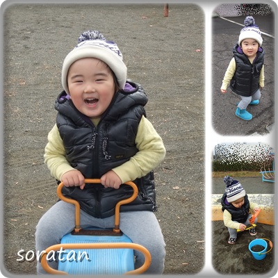 2歳3ヶ月と4日目今日は、、曇だけど、、なんだか暖かいので、、散歩&買い物の帰りに公園へ地味に久々の公園遊びで、、soratan大興奮めちゃめちゃ積極的で、、「シーソー乗ろうよ」と誘われ、、(誘うようになるなんて。。涙)ちょっと乗っては、、下りてたのに、、キャーキャー言って大喜び、、2台を交互に乗りながら(笑)15分くらいは乗ってたわっでも、、最高の笑顔が見れて良かったぁーケラケラ笑う姿は可愛くて、、ママもとっても幸せになる親バカ~。。あー。。もっと暖かい日が続けばいいのになぁ。。鉄棒もやるやると言うけども、、ほんの少しぶら下がって落ちちゃう苦手らしい。。ケケケそして、、急に、、「ママお腹空いた。。」ってしゃがみ込み、、悲しい顔意外とママはもっと遊びたかったのに。。ケケケ