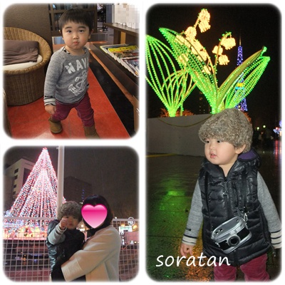2歳3ヶ月と23日目今日は、、予定満載パパは午前中お仕事、、その間にママは美容室へなので、、soratanは、、ばぁばとじぃじとお留守番もう、、全然普通に、、「ばいばーーい」だもんね「ばぁちゃん車買ってね。。あーメロンパンも食べたいなー」とか言ってるしそして、、パパが帰ってきて、、soratanを迎えに行きまたまた、、復活した、、歯医者へ、、ママと合流ママとパパが一緒に治療すると、、号泣していたのに、、託児室の先生と普通に遊んでたわ随分成長して、、楽になったなぁーー。。ちょっと寂しい。。。そして、、パパが美容室に行き、、ママと買い物して、、時間差で、、soratanも美容室へあーーーー忙しいsoratanは、、カット中もおとなしく、、下向いてーとか、、こっち向いてーにもちゃんと答えてて、、美容師さんも、、優秀だなーホホホおやつで、、つってたけど、、そして、、ちょうど良く、、パパも終わり、、3人で帰れたーーハァーハァーこれも、、パパのバースデー月で、、一緒の日だと30%オフの為。。あーー疲れたぁーー予定通り終わったので、、ご満悦で、、帰りに、、イルミネーションを見に地味にsoratanは初めてかもーー夜で、、寒いんだもんねーーーでも、、「キラキラして、、キレイだねー」ってキャーキャーはしゃいでたクリスマスですなぁ~