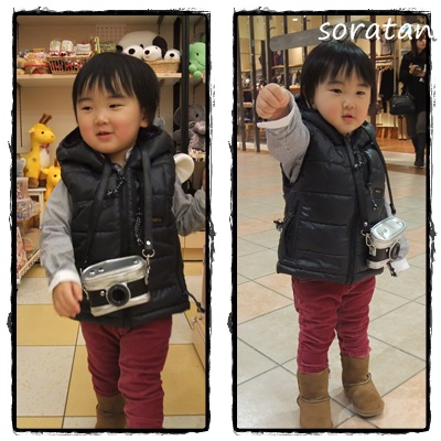 2歳3ヶ月と9日目今日は、、パパは午前中お仕事だったので、、お昼食べてから、、soratanの予約していた服を回収にGO最近お気に入りのカメラケース!いろんな人に声かけらるっカメラじゃなくて、、大事な車が入ってるんだよねーついでに、、クリスマスツリーも買おうって事で、、いろいろ見たりそれにしても、、雨で天気が悪いからか、、どこの駐車場も長蛇の列人混みってやっぱり疲れるーーーsoratanに久々に沢山、、洋服を買ったかもいつも、、ばぁばだったもんね。。ケケ。。ショップのお姉さんとも仲良しなsoratan。。何故か、、店長さんの事「おじぃさん」って呼ぶんだけど(笑)。。性別違うしっ。。。可哀想だよーーーー。。何でだろっそして、、帰りに、、絵本を買いに行ったら、、トミカの本を見て、、すんごい大きい声で、、「これ買ってーーーーー」いつも「これ欲しいなぁ」とかだったのに、、初の「買って!買って!」攻撃恐れてた事が、、始まっちゃったのね。。。(汗)「買わないよー」とあっさりかわしてると、、小さい声でぶつぶつ、、、「あーーー。。これにしようかなぁ。。これか。。そうだ、、これ買ってあげよう!!」とかって言ってた(笑)思わず突っ込みたくなっちゃったわそして、、買ったのが、、ノンタンのサンタの絵本帰って、、読んでから、、「サンタさんプレゼントくれるの?」って言ってる。。あら、、この本、、間違ったかな(笑)