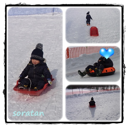 2歳5カ月と19日目今日は、、午前中は、、お家を検討中の方が、、ウチの見学に来て、、掃除やら、、おもてなしやらで、、大忙し待ちに待った、、パパと遊べる日なのに、、可哀そうだからと、、昨日飲み会で朝方帰って来たパパが、、頑張って、、午後から、、、ミニスキー場へ連れて行ってくれたぁーー噂通り、、子供用って感じで、、キッズパークがいっぱいソリ用の山もあり、、いざっソリを持って行くのを忘れ、、借りるハメに。。あちゃっ。。ソリで滑るのって、、何十年ぶりって感じだったけど、、パパもママも大はしゃぎ楽しいー。。soratanは、、最初は固まってたけど、、慣れてきて、、なんと、、自分でソリを持って上り、、「楽しいー!もう一回滑る」と言って、、一人で乗って滑ったぁーー滑り下りて行く、、小さい背中が、、何ともかわいくて。。そして、、ママが大好きな、、チューブ滑りここのは、、結構な長距離で、、ぐるぐる回って、、雪山にぶつかりながら落ちて行く感じで、、ママでさえ、、怖かったーー。。パパも、、soratanと二人は、、危ないと、、1回で終了。。そして、、ジェットスキーもちろん、、パパと乗ったけど、、最初は、、エンジン音で号泣。。拒否。。エンジンを切ってもらい、、なんとか乗せて、、出発後半には、、パパと手を振る余裕も降りたがらなかったしねそして、、ママと馬ソリにちゃんと、、5周回って、、馬は出口に進んでた事に、、ビックリのママ(笑)soratanは、、「お馬さんに乗るー」って言い張ってて、、乗れる馬もあったけど、、大変そうなので却下。。ゴメンヨ。。一度、、馬に乗って楽しかったのを覚えてたんだなぁーーたーっぷり満喫して、、爆睡したsoratan。。何度も、、「楽しいー」って言ってたから、、良かった。。また、、行こうねーーー。。