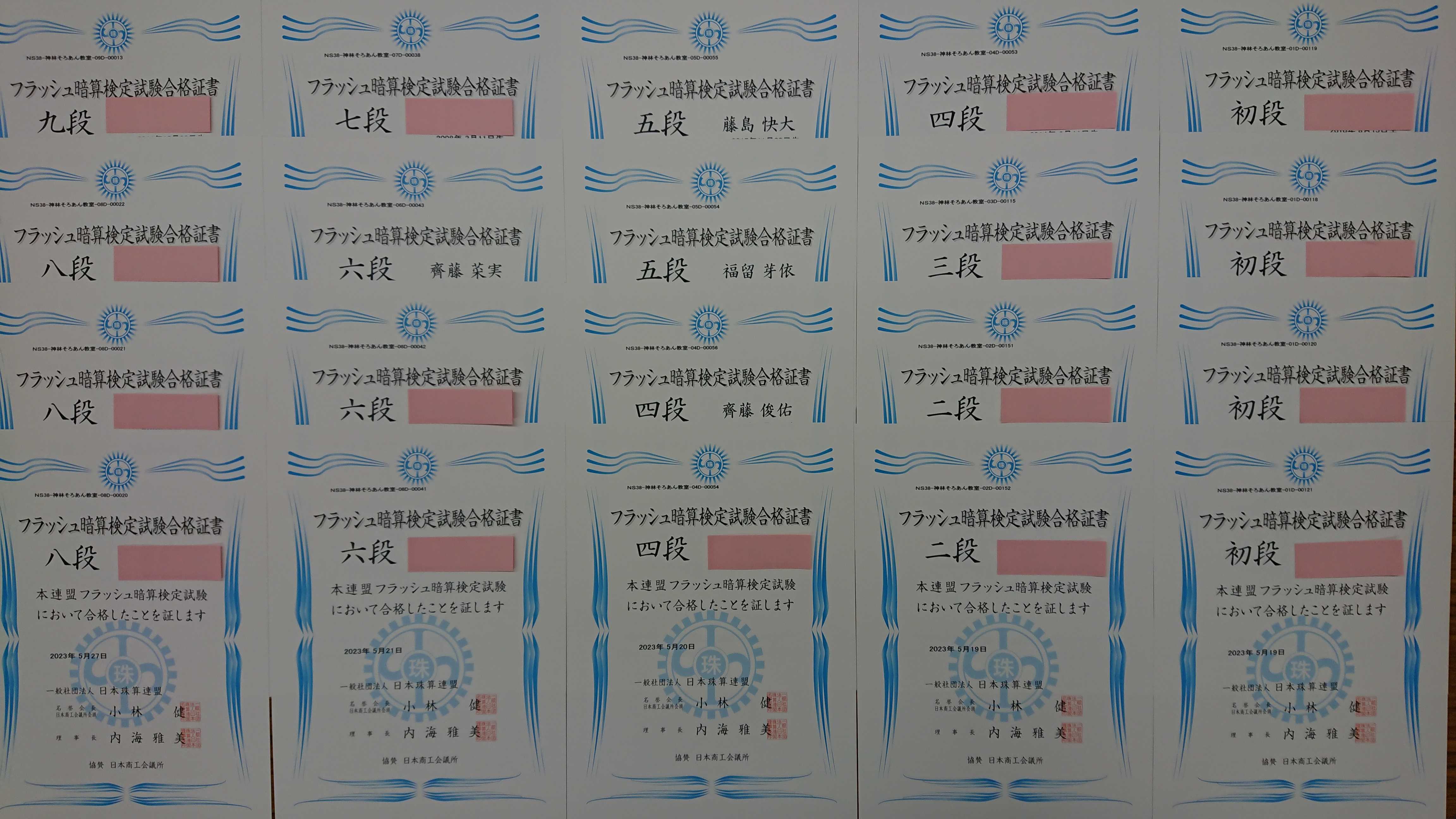 そろばん教室 横浜市神奈川区 藤沢市そろばん教室 横浜市緑区 藤沢市本鵠沼のそろばん教室七島教室 横浜市神奈川区七島町123 七島交差点脇東本郷教室 横浜市緑区東本郷4-13-31 本郷神社前鶴屋町教室 横浜市神奈川区鶴屋町3-28-3 202藤沢教室 藤沢市本鵠沼3-12-30 302ベトナム料理店上教室のfacebook 教室のHPはこちら=●日本珠算連盟正会員(会員No.41800240)●フラッシュ暗算検定施行塾=フラッシュ暗算検定の段位合格者= 日本珠算連盟主催(2023年5月実施)今回は、20名の段位合格者が出ました!合格者の最年少は小学2年生の3人です。 藤島快大 5段 精華小 福留芽依 5段 東京都港区立御田小 齊藤俊佑 4段 聖マリアンナ小※5段は、2段の2倍以上のスピードです=フラッシュ暗算検定試験の段位合格者 数で教室を選ぶことが重要=当教室には、現役生で、フラッシュ暗算段位を取得している生徒が100名ほどいます。過去の生徒を含めると、段位合格者は、500名以上です。 〇3桁の暗算練習についてプリントの練習は、筆算のように、下1桁や下2桁で問題を分割して答えを出すこともできますが、このような指導をする教室は避けてください。『私は指導力がありません!』と、先生自ら指導力の無さを示しています。フラッシュ暗算段位の問題は3桁です。画面に表示される数を瞬時に入れていかなければならないことから、プリントのように分割することができません。当教室では、3桁の問題も一括で(3桁で)計算します。1桁や2桁で分割する生徒はいません。プリント練習は一番難しい練習で、そのことに指導者が気づいていません。その前に徹底的にしなければならない練習があります。それは、フラッシュ暗算でもありません。ここに、当教室と他の教室との決定的な差があるのだと思います。〇フラッシュ暗算検定試験 試験日 7月26日(水)~7月30日(日) 締め切り 7月9日(日)10段31名を輩出している教室の指導力は、他の教室とは違います! 5月検定で10段合格者が1名でました! あと1名は、本部審査中です!〇新年中さんから受け付けます! お子様の将来が、大きく変わります!入塾に関することは・・・ soroan123@yahoo.co.jp まで