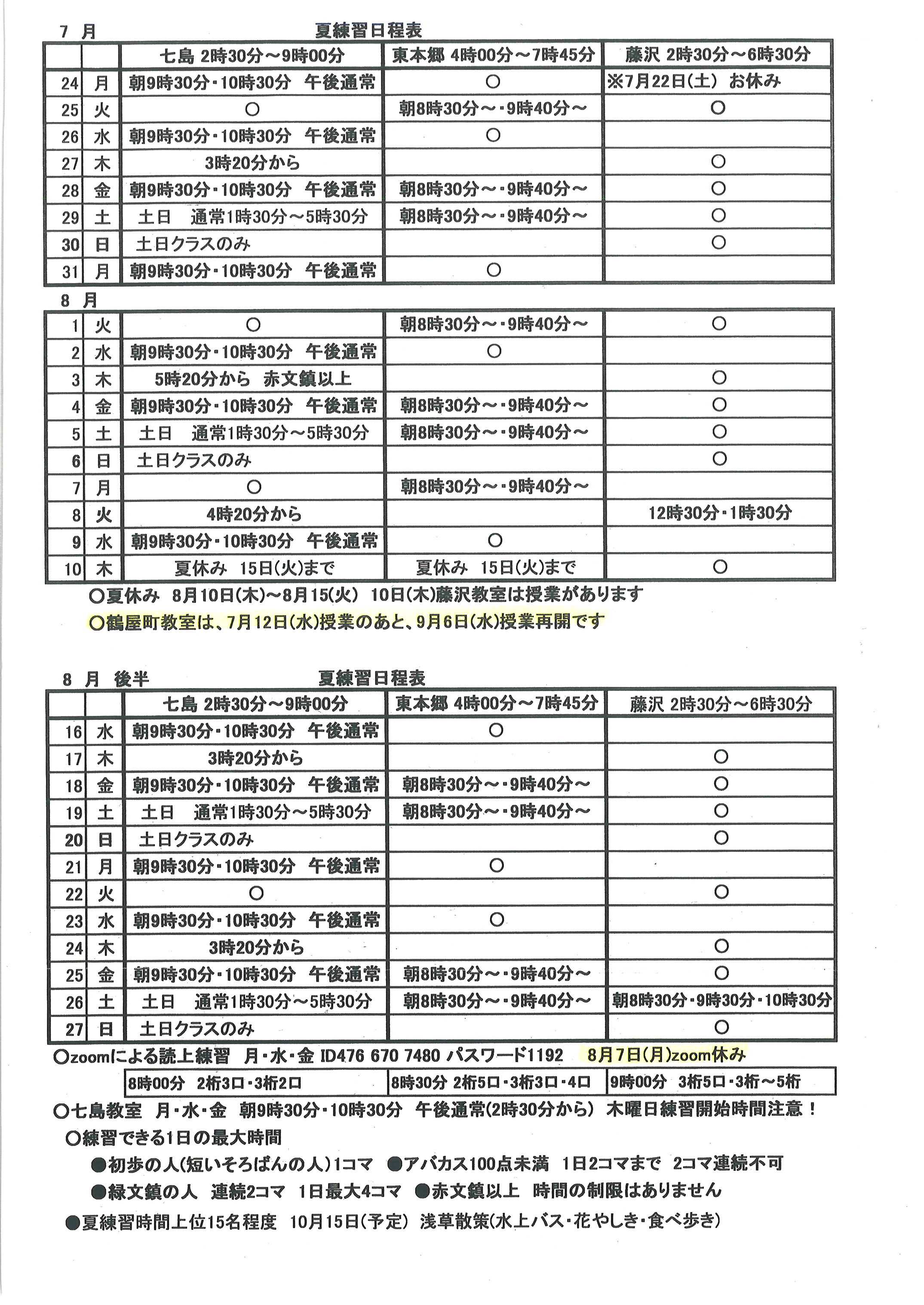 そろばん教室 横浜市神奈川区 藤沢市そろばん教室 横浜市緑区 藤沢市本鵠沼のそろばん教室七島教室 横浜市神奈川区七島町123 七島交差点脇東本郷教室 横浜市緑区東本郷4-13-31 本郷神社前鶴屋町教室 横浜市神奈川区鶴屋町3-28-3 202藤沢教室 藤沢市本鵠沼3-12-30 302ベトナム料理店上=教室のfacebook 教室のHPはこちら=●日本珠算連盟正会員(会員No.41800240)●フラッシュ暗算検定施行塾 夏練習時間について『○が付いている日』が、その教室の通常時間の練習日です。時間が入っている場合は、その時間での練習になります。七島本部教室は、ほぼ毎日東本郷教室・藤沢教室は、週5日程度の練習を組んでみました。夏練習の時間数が多い人は、10月に浅草散策が4年ぶりに復活します!水上バスで浅草に入り、花やしきや、仲見世通りの食べ歩きをします。時間に余裕のある『夏』ですから、できるだけ練習に参加してください。(ただし、レベルにより練習時間の上限があります。)暗算10段31名を輩出している教室の指導力は、他の教室とは違います!(暫定10段1名 本部審査中)〇新年中さんから受け付けます! お子様の将来が、大きく変わります!入塾に関することは・・・ soroan123@yahoo.co.jp まで