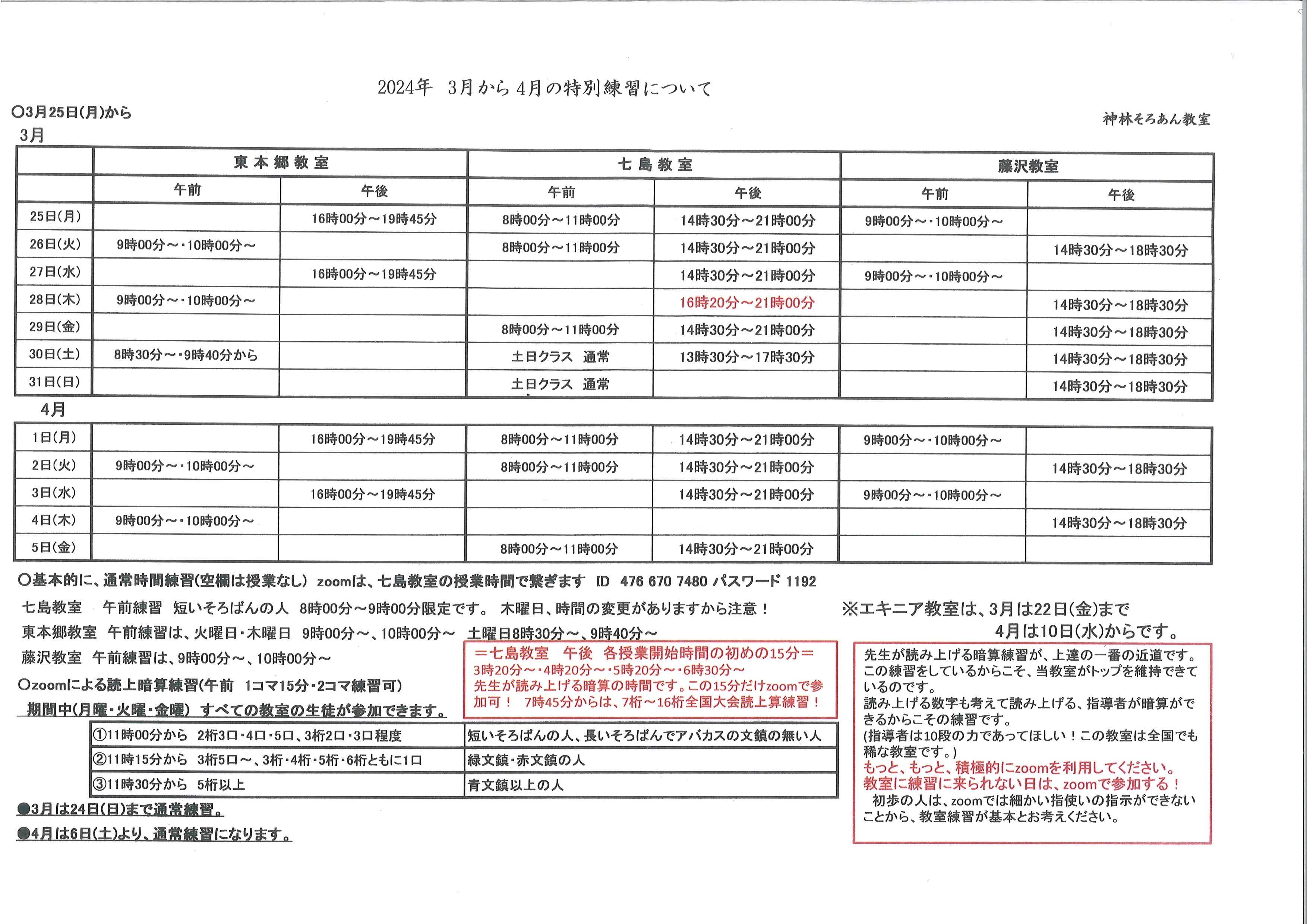 そろばん教室 横浜市神奈川区 横浜市緑区 横浜市西区(横浜駅前)のそろばん教室 藤沢市本鵠沼のそろばん教室七島教室 横浜市神奈川区七島町123 七島交差点脇東本郷教室 横浜市緑区東本郷4-13-31 本郷神社前エキニア教室 横浜市西区北幸1-1-8 4階 レンタルスペース藤沢教室 藤沢市本鵠沼3-12-30 302ベトナム料理店上教室のインスタはこちら教室のfacebook 教室のHPはこちら〇学校が春休み期間中の練習について 基本的に通常練習ですが、時間の変更・ 練習時間の追加等があります〇29日(金) all japan 全国大会 会場 大田区産業プラザPio 10時30分会場 七島本部教室から先生と行動する 人は、9時45分教室集合です体験の予約は、メールにてお願いします soroan123@yahoo.co.jp まで暗算10段36名(昨年は6名が10段合格)神奈川県下で他の教室を選ぶ選択肢ってありますか?圧倒的な『暗算力』を身につけることができます!練習そのものが楽しい!練習に真剣に取り組む、そんな経験がこの先の人生に大きな財産になると思います!