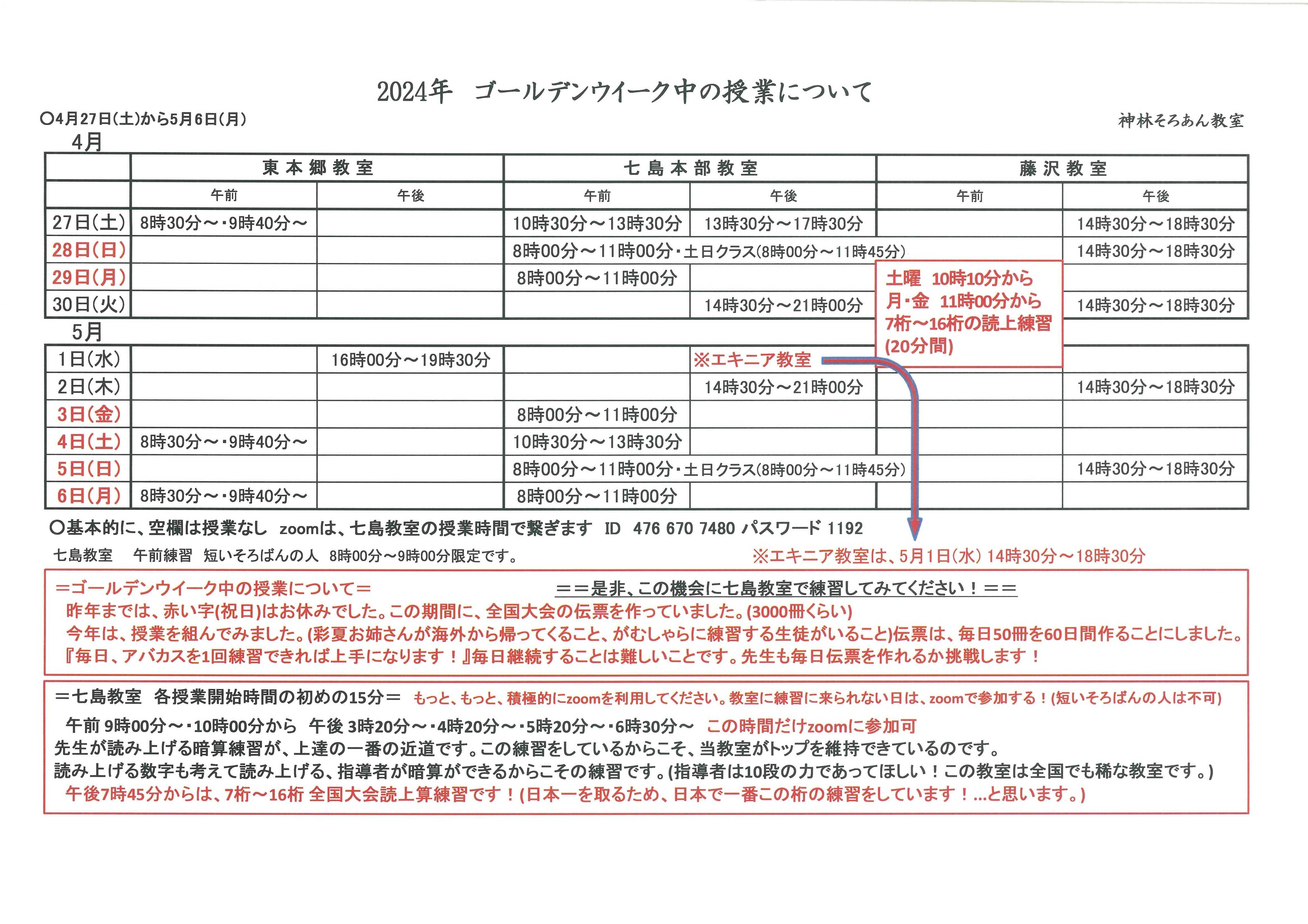 そろばん教室 横浜市神奈川区 横浜市緑区 横浜市西区(横浜駅前)のそろばん教室 藤沢市本鵠沼のそろばん教室七島教室 横浜市神奈川区七島町123 七島交差点脇東本郷教室 横浜市緑区東本郷4-13-31 本郷神社前エキニア教室 横浜市西区北幸1-1-8 4階 レンタルスペース藤沢教室 藤沢市本鵠沼3-12-30 302ベトナム料理店上教室のインスタはこちら教室のfacebook 教室のHPはこちら〇ゴールデンウイーク中の授業について入塾説明会のお知らせ5月12日(日)入塾説明会を開催します。七島本部教室 ①13時00分 ②14時30分説明会に参加を希望される方は、5月6日(月) 22:00よりメールをお受けします。お子さんには、簡単なペーパーをやっていただきますので、なまえと数字(1~10)は書けるように練習しておいてください。募集クラスA.土曜・日曜クラス(新年中児・年長児 七島教室)B.通常クラス(新年長児以上 東本郷教室・七島教室・ 藤沢教室・エキニア教室)参加を希望される方は、件名に『入塾説明会参加希望』と書き下記宛にメールをお願いします。(空メールでかまいませんが、 保護者の方の お名前をお願いします。)soroan123@yahoo.co.jpメールをいただいた方から、返信のメールをお送りします。必要事項を記入の上、返信をお願いします。優先順位について七島教室は、早い段階で定員に達することが予想されます。誠に勝手ですが、入塾に関して優先順位をつけさせていただき ます。1.ご兄弟が在学されている方2.知り合いのお友だちがいらっしゃる方3.返信のメールの順位(説明会希望のメールをいた だいた順位)説明会希望のメールを早い時期にいただいても、返信の メールが遅い方は、順位が下がることをご了承ください。また、あまりにも幼い人や、自分の感情をコントロールできない人、 他のお子さんに迷惑を及ぼすおそれがある人は、申し訳ありませんが、 入塾をお断りすることがあります。すべての子どもたちに、あんざんを通して、『自分に自信を持てる生徒にしたい』強い気持ちで指導にあたっています。人の出会いは『縁』です。やる気のあるお子さんの参加をお待ちして います。暗算10段36名(昨年は6名が10段合格)神奈川県下で他の教室を選ぶ選択肢ってありますか?圧倒的な『暗算力』を身につけることができます!練習そのものが楽しい!練習に真剣に取り組む、そんな経験がこの先の人生に大きな財産になると思います!教室を選ぶ基準①10段合格者が複数在籍している教室 (できるだけ多い方が好ましい)②一番上手な生徒に目が行きがちですが、 その教室で過去から現在までで、100番 はどのくらいかで、その教室の指導力が わかると思います。 当教室は8段(暗算)です。(あと少しで 9段になります!)圧倒的な『暗算力』を身につけることができます!練習そのものが楽しい!練習に真剣に取り組む、そんな経験がこの先の人生に大きな財産になると思います!