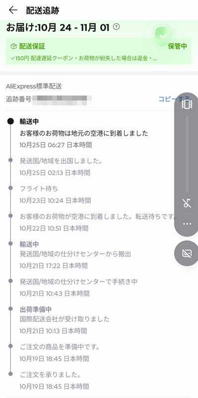 今日は早めで帰宅は18時過ぎ。現在、AliExpress方面から何かが接近中。(^^;明日ぐらいに到着か?現地の空港での待ちがちと長かったような気がしますが、通関も順調やったようでひと安心。--- 18:40 ---