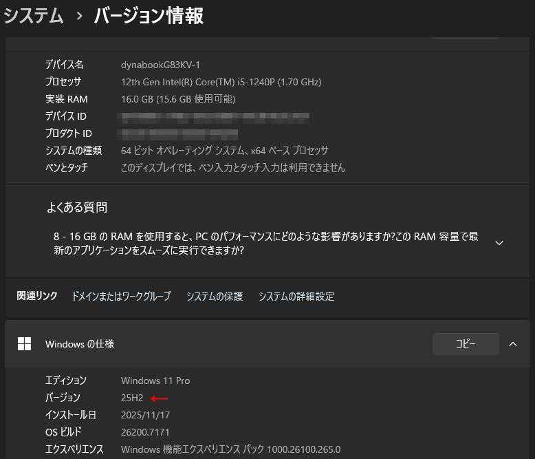 今日は在宅勤務。Windows 11 25H2 が 24H2 の Windows Update に出てくるけど、何かエラーが出てインストールできなかったので、Windows のインストールメディア作成ツールで 25H2 のインストールメディアを作成し、それを利用して24H2 から 25H2 にアップデートしました。試してみたのは dynabook G83/KV (Core i5 1240P, メモリ16GB, SSD1GB)です。最初、アップデートの際に更新プログラムをチェックするようにしてましたが、46%でスタックしてしまったので、一旦アップデートを中断して、更新プログラムのチェックなしにしてアップデートしました。こうすると更新プログラムの確認をしにいかないので、46%問題は起きませんでした。アップデートも時間はかかったけどすんなりいきました。25H2にアップデート完了更新プログラムのチェックをしなかったので、アップデート後に山盛りのWindows Updateが来るかと思ってましたが、24H2の時点で Windows Update を完了させていたためか、出てきた更新プログラムは2つだけでした。更新プログラムは2つだけっちゅうことで、Windows 11 25H2 のインストールメディアを使っての 24H2 からのアップデートは問題なく実行することができました。Windows Update 待ってるよりは手っ取り早い気がしました。--- 17:30 ---