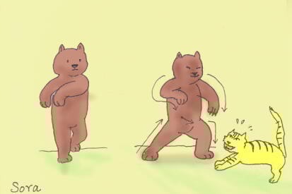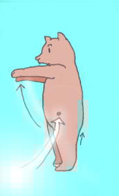 古代中国でつくられた導引術(今の気功)の原形に五禽戯(ごきんぎ)という、動物の動きをするものがあります。動物のもつたくましいエネルギーやその魂に対するアニミズム(自然霊、自然パワー信仰)のあらわれです。ヨガにも動物の名前がついたポーズ(アサナ)が沢山ありますね。それも同じ意味があります。蛇のもつ生命エネルギーにあやかる、かま首をもたげるコブラ(ブジャンガーアサナ)とか・・・ 今回から、新カテゴリー動物キャラでいろいろレッスンというものを 始めます。その第一回は くまキャラ”そら”の五禽戯(ごきんぎ)のひとつ 単擘熊(たんひゆう)です。アニマルキャラでいろいろレッスンNo.1 五禽戯(ごきんぎ)単擘熊(たんひゆう) ”そら”はpupujonjonさんに ネーミングしてもらいました。ありがとうpupuさん♪(・^v^・)♪ pupuさんのハンドルネームも 彼女のくまのぬいぐるみから来てるし ぼくも”ぷーさん”というあだ名のときがあったので クマ繋がり(笑)でお願いしていました。単擘熊(たんひゆう)は熊の歩きです。片側に両腕を垂らした姿勢から、後ろ足を踏み出します。踏み出した側の腕も同時に前に出し膝のほうへ垂らします。後ろ足側の腕は、胸の前へ持ってきます。下半身は弓歩(ゴンブー)という形になります。 前足先は正面、後ろ足は斜め45度に開き おへそ、腰は正面に向けます。 両足の間は前から見てこぶし一つ分開けます。 前の膝は踵より前に出てはいけません。 後ろ足踵で地面をしっかりふみ前足に 体重をのせて腰、体を押し出します。上は僕が太極拳を習う時、先生から、いつも聞かされている弓歩の説明で、もう暗記してしまいました(笑)この弓歩の形、あるヨガポーズ?の説明に使えますね。ヨガをやってる人ならすぐわかります。そう!ウォリーア1(ビラバドラーアサナ)です。足の幅を拳一つ開ける以外は、ウォリーア1そのものです。この下半身をしっかりさせる姿勢は、武道、ヨガ、気功に共通のものなんです。 そして、上半身はリラックス、両手はだらんとした 熊になります。でも、すぐ目の前にいる、虎に攻撃できるパワー充実した形です!「上虚下実」息を鼻から吸いながら、足を引き寄せ足を踏み出し、踵から着地、息を口から吐きながら体重を前足にかけていきます。これを左右繰り返し前進していきます。以上 くまちゃんウォーキング、導引術・五禽戯の単擘熊でした。 PS 次回はねこキャラ”くー”の登場です♪ ネコのポーズバリエーションかな??d(^-^) この本がおすすめ、周天法というヨガでいうクンダリーニ法もくわしく載っています。