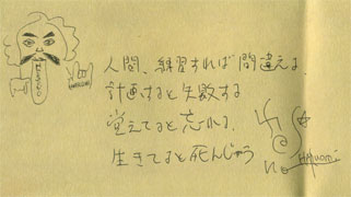 座右の銘としたいお言葉。昔聞いたものから、最近のものまで列挙。○「お前は気持ち悪い。柴田恭兵より気持ち悪い」 (ピエール瀧) ラジオで、まりんに対して放った暴言。「気持ち悪い」と言う単語を聞くと俺の脳内では即座に柴田恭兵との比較が開始されるようになった。○「俺が思うに、キリストってFuckin' ポジティヴなヤツだったんだよ」 (ダフ・マッケイガン) パンク(馬鹿)の頭脳が放った最大限の賛辞。俺のキリスト観もこれで確定した。○(世の中を良くするにはどうすれば、と言う質問に)「政治家を殺す」 (ジョージ・ハリスン) 神を愛し、自然と共に生き、心穏やかな、静かなビートルが80年代終わり、トラベリング・ウィルベリーズVol.3の頃のインタビューで発した含蓄に富んだお言葉。彼にはポール・マッカートニーのこの言葉を贈りたい。○「ジョージは大人のティーンエイジャーさ」 いや、それどころか中学生レベルだし。○人間、練習すれば間違える 計画すると失敗する 覚えてると忘れる 生きてると死んじゃう (細野晴臣) 最後は本当にいい言葉を。今回のDVD、ディスク2に封入されてるポスターの裏に書かれている(ディスク1のMCでも言ってる)。会場は爆笑だったが、マジで含蓄のある言葉だと思う。特に細野さんの口から出ると。○桜田門外の恋 「恋」と「変」を間違えるパターン、山ほどあるが、「変」を「恋」に間違えるのはあまり見かけない。(ってコレは全然関係ない・・・・)