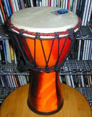 今年の新成人は過去最少、ということは20年前の出生率が過去最低、という意味なんだよね(98年現在で)。「そうじゃない」ということになると少し怖い。成人まで生き残れた人が過去最少。 Tocaの小口径ジャンベを衝動買いした。手頃な太鼓が欲しくて、でもボンゴは小さいのしか持ってないし、どうしようかな、と迷っていたら楽器屋でコレと出会った。もしやと思って少し叩いてみたら、今まで叩いたどの楽器よりあの「初期T.Rexでミッキー・フィンが叩いていた謎の太鼓」に近い音がする。勿論ジャンベなんであの独特の倍音があって、ミッキーのアレと同じではないんだけど、低音も出るし、サイズも値段も手頃だし、コレしかない!と即行レジへ。なに、CD2枚買わなければいい程度の値段だ。 早速BCW(-1)で使ってみる。T.RexヴァージョンでSummertime Bluesをやることになっていた(勿論シングルヴァージョンね)ので丁度良いので試す。ばっちりだ。まあ、結論としてやっぱりアレはジャンベじゃないんだけど、コレはコレで良い。 さて、写真をよく見るとヘッドに青い半透明のものが見えると思う。実はコレ、ドラムのミュート用のムーンジェル・・・なんて良いものではなく、実はOA機器用の耐震粘着マット、しかも100均で買ったパチもんである。 何を思ったか、ってーとそれは勿論「ミュートしたらアレっぽくならないか」というアイデアだ。結論としては大正解。結構「ズバり」の音だ。早速Jewelをやりたくなっている俺がいる。Elemental Childでも可。 一時期はダラブッカかとも思ってたがなぁ。ホントは何なんだろうなぁ。