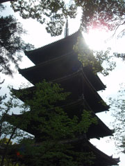 その後も歩いている。 バスで金閣寺へ。金ぴかを軽く流して竜安寺~仁和寺方面へ歩く。やっぱり歩く。竜安寺には全長20mの鹿威しがあると聞いたのだが、庭園を見るのに500円払うのは俺の趣味じゃないので通過。 仁和寺も庭園ではあるのだが、仏像も五重の塔(写真)もある。しかし金堂の特別公開は来週から…。無念。 バスに乗ろうと思ったら子供と老人が山盛りで並んでいたので、清水の舞台から飛び降りてタクシーに乗り込む。観光地の運転手は楽しい。そういえばこの二日でまともに会話したの飛鳥寺のおっさんとこの運ちゃんだけだ~。追記)なんで俺はこう逆光の五重塔が好きなんだろう。