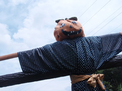 旅行中はちょっとした「ブロガー」だな、俺は。しょこたんは無いけどね。 とりあえず宿にチェックインし、軽くシャワーを浴びてから新京極等をぶらついた。何故かふらりとグラニフに入ったりする。昨日新宿、一昨日町田で入りそびれたのだ。買わないんだけどね。ああ、ポップなのあるなあ、で終わり。2枚で4200円は良心的だと思ったが。 まあ所詮商店街なので、京都だからどう、ということはなく普通に買い物客風の行動である。ただ、着替え回数が予定外に増えちゃったからTシャツと下着を買おうかなぁ、とは思ってるんだけど。あとタオル。ってそうしたら明日涼しかったりするんだよな。世の中ってそんなもの。 新京極のヴィレッジ・ヴァンガードに行くのは2回目だが、雑然としてるのにちょっとおしゃれ度が高すぎるんじゃないの、という感じ。新宿丸井店ほどじゃないけど。やっぱり町田か下北がいいな。いや、滅多に来ない所に文句つけても仕方が無いんだけど。 あ、ちなみにコレ、ネカフェで書いてます。携帯はしんどいね、やっぱり。 なお、例によって旅行中の記事は帰宅後に一気に画像が追加されます。(追加されたのはこの日、法輪寺手前にいた案山子)