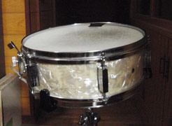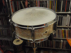 何故に俺はもう大丈夫なのか。 帰り道、茅ヶ崎のハードオフに何となく立ち寄った。たいしたものないなぁ、と思いながらジャンクのコーナーに行ったらコレがあった。ご覧の通りのヴィンテージ感溢れるスネアである。コレが何と1500円。「現状販売です」としか書いておらず、この値段だからなにかあるんだろうと思って全体をよく見るが、目に見えるダメージなどは見当たらない。どこを見てもブランド名などは全く解らないのだが、この値段でこのルックスなら、音的に失敗でも文句は無いだろう。一瞬の迷いもなくレジに直行。ケースどころか袋も無いのでむき身で持ち帰る。 いかにも昔のスネア、という形状のストレイナー、内蔵ミュート、6テンションという仕様、そしてこのカバリング。持って見ると異様に軽くて、何の木を使ってるんだろう。よっぽどショボい木に違いないぞ。シェル内側は黒く塗装してあるんだけど、エッジ部が剥げていてもしかしたら前のオーナーが勝手に塗ったのかも知れない。 叩いてみると、結構使えなくも無いような音がする。少なくともこないだの変なアルミ(?)シェルのガラクタよりいい音であることは間違いない。ラグか、ボルトか、どっちが原因か解らないけど堅くてチューニングし辛く、6テンションのせいかわからないけどピッチも合わない。コレはもう味と割り切ってミュートで音を作るか。ヘッドはへたっていないので交換の必要は無さそう。 チューニング後に叩いてみたらなんか変な金属ノイズが聞こえる。どうやらスナッピーに原因がありそうだけどよく解らない。バンドに入れば埋もれるノイズだと思うけど。 とりあえず今日の練習で試してみよう。