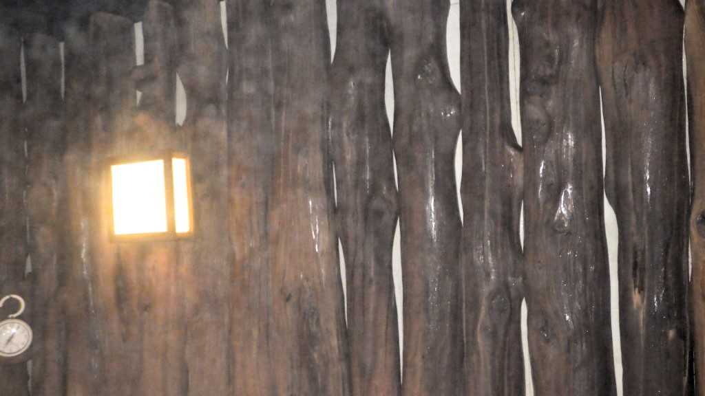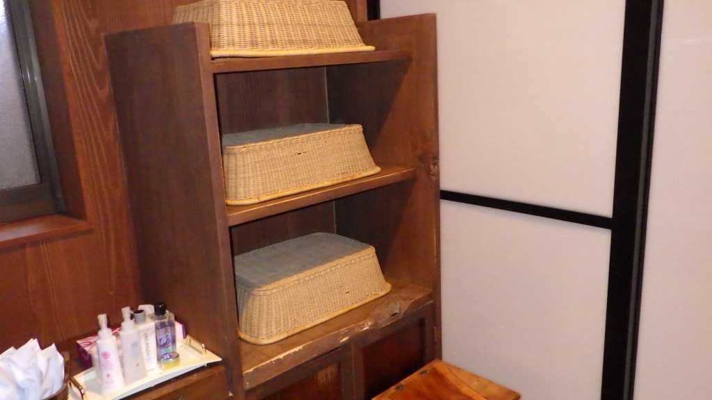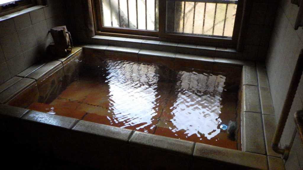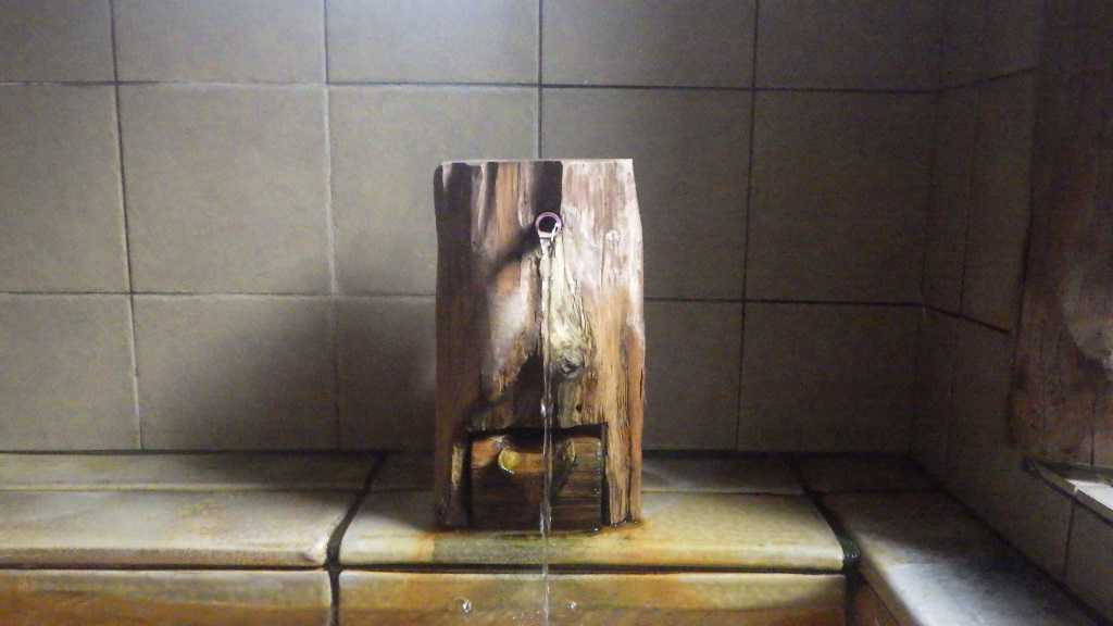 内湯だけですが、窓の外には、紅葉の景色が楽しめます。湯口も、渋い。 壁は、勝沼の大一葡萄園で使用された日本最古のぶどう棚の杭が使われているそうです。