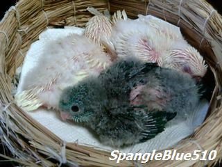 1月17日にご紹介した「てんこもりイノ~ず」の弟妹にあたる3羽が巣箱デビューしました!鳥の種類:サザナミインコカラー:1号・2号 クリームイノ & 3号 ブルー両親:コバルト♂×クリームイノ♀オハチに入れると、最初、ここはどこ?・・という感じで、チョコチョコ動き回っていました。でも、すぐに3羽ともぐっすり眠ってしまいました。『寝る仔は育つ!』で、ヒナは寝ることが大切です(笑)。食べて寝るのを繰り返すことで、少しずつ成長するのです。生後20日過ぎですが、みんな体重50~60gと体格はよくて、しっかりしています。今日からは、パパ&ママの代わりを務める飼い主です。たくさんのインコちゃんたちのお世話は大変ですが、頑張りますっ!!