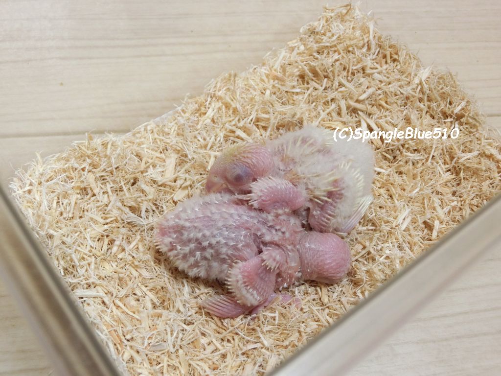 ようやく朝晩が少しひんやりしてきました。でも、日中はまだ暑いですね。秋ヒナが孵っています。■両親:モーヴ/イノ♂ × クリームイノDd ♀両親は餌も副食ももりもり食べてヒナに運びます。【 ヒナ 】鳥種:サザナミインコカラー:コバルトまたはモーヴ性別:不明生年月日:2023年10月3日お名前: 秋1号(仮称)備考:鳥種:サザナミインコカラー:コバルトまたはモーヴ性別:不明生年月日:2023年10月5日お名前: 秋2号(仮称)備考:鳥種:サザナミインコカラー:コバルトまたはモーヴ性別:不明生年月日:2023年10月10日お名前: 秋3号(仮称)備考:この両親からは、クリームイノ、コバルト、モーヴの3色が生まれます。今回、3羽とも黒目ちゃんなので、コバルトかモーヴのどちらかになります。いずれにしても、性別は遺伝的にわかりません。里親募集については検討中です。すくすく元気に育ってほしいです!! CAP!さんで、2025年版365days鳥どりカレンダー販売中! Instagram インスタグラム spangleblue2022ほぼ毎日更新。ブログ未公開の写真や動画も載せています。 ブログランキングに参加しています にほんブログ村人気ブログランキング 応援していただけると飼い主とインコちゃんの励みになります!