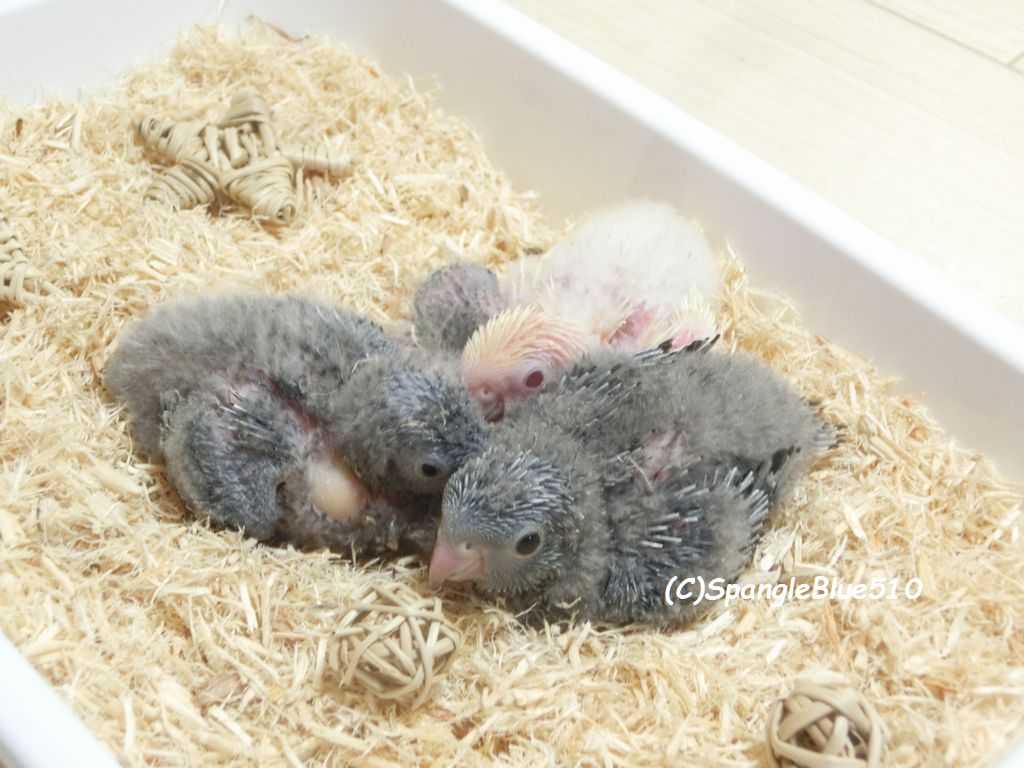 つい先日まで暑くて冷房をつけていたのに、秋を飛ばして急に冬になったかと思うような寒さです。急な温度変化で身体がついていくのが大変ですが、皆さんも体調管理にご留意の上お過ごしくださいませ。10月22日、サザナミインコのヒナが巣箱からデビューしました!!■サザナミインコ チームA 両親:モーヴ/イノ ♂ × クリームイノDd ♀ この両親はお世辞にも子育て上手とはいえないのですが、 今回は4羽孵化したヒナをみんな無事に育ててくれました。すみません!今日、個別写真を撮るつもりが撮りそびれたので、集合写真しかありません。どの仔もまだカラーはわかりません。この両親からうまれる子供は遺伝的に性別判断できません。性別を知るためにはDNA性別鑑定検査が必要です。■1号ちゃん鳥種:サザナミインコカラー:コバルトまたはモーヴ性別:不明生年月日:2025年10月6日お名前: 秋1号(仮称)備考:■2号ちゃん鳥種:サザナミインコ品種:クリームイノ性別:不明 生年月日:2025年10月8日お名前: 秋2号(仮称)備考:■3号ちゃん鳥種:サザナミインコカラー:コバルトまたはモーヴ性別:不明生年月日:2025年10月9日お名前: 秋3号(仮称)備考:■4号ちゃん鳥種:サザナミインコカラー:コバルトまたはモーヴ性別:不明生年月日:2025年10月12日お名前: 秋4号(仮称)備考:また、別のペアから1羽だけヒナが孵っています。まだ小さいのでデビューは先になります。■5号ちゃん鳥種:サザナミインコカラー:未定(ルチノーとクリームイノ以外)性別:♂(遺伝的判断)生年月日:2025年10月18日お名前: 秋5号(仮称)備考:カラーと性別によっては、里親様を募集する予定です。みんなすくすく元気に育ってほしいです!! Instagram インスタグラム spangleblue2022ほぼ毎日更新。ブログ未公開の写真や動画も載せています。 ブログランキングに参加しています にほんブログ村人気ブログランキング応援していただけると飼い主とインコちゃんの励みになります!