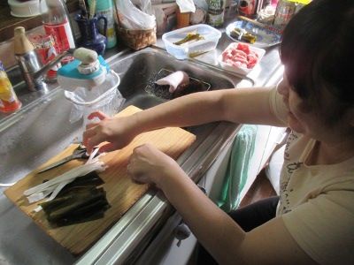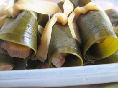 豚ロース肉を昆布で巻き、かんぴょうで縛ります。