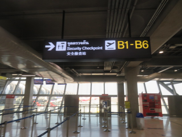B4のゲートに向かいます。出発の案内板。この先が保安検査場です。保安検査場を通過しました。左側に奇数のスポット。右側が偶数のスポット。右側へ進みます。現在はTGのサムイ島行の便の搭乗が行われているようです。搭乗機を待つボーディングブリッジ。向こうにはエミレーツ航空のA380が見えます。ここでもお掃除ロボットは活躍中。まだ時間があるので周辺をウロウロ。ここは一番先にあるB5搭乗口。ボーディングが始まっています。再びB4搭乗口に戻りました。搭乗機はまだです。バンコクエアウェイズが通っていきました。