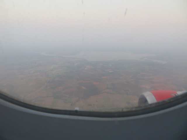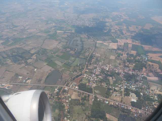 眼下に広がるのはウドンタニ―の田畑。右に旋回した後水平飛行。赤い土のコラート台地が続きます。ところどころにぽつりぽつりと雲が漂っています。離陸から40分ぐらいでしょうか着陸体制です。ㇿッブリーそしてサラブリーからナコーンナヨックへ。眼下には工場群が見えてきました。その工場群を見ながら高度を下げていきます。下には住宅街も見えます。運河沿いにお寺も見えます。ぐっと高度が下がり住宅地がすぐそこです。そして空港内の敷地に入り間もなく着陸です。