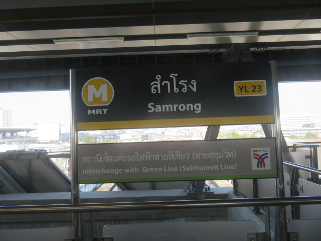 翌日はウドンタニ―に戻ります。ホテルをチェックアウトしてまずはBTSアソーク駅へ。BTSスクンビットラインのアソーク駅から乗り込みました。そして下りたところはこちら。BTSスクンビット線サムロン駅です。サムロン駅で乗り換えです。MRTのイエローラインに乗り換えます。まずはBTSサムロン駅の改札を出ます。そこから案内板に従ってMRTのイエローラインに。連絡通路の途中にトイレがありました。ここから3番出口左側へ。連絡通路を進みます。ところどころにイエローラインの車両と赤い➡があります。ですから迷うことなくサムロン駅にたどり着くことができます。案内板に従って進むと迷うことはありません。ここにもMRTのイエローラインとBTSスクンビット線の案内がありますね。MRTのイエローラインのサムロン駅です。ホームに上がってきました。サムロン駅は始発・終点の駅ですからレールがここで途切れています。