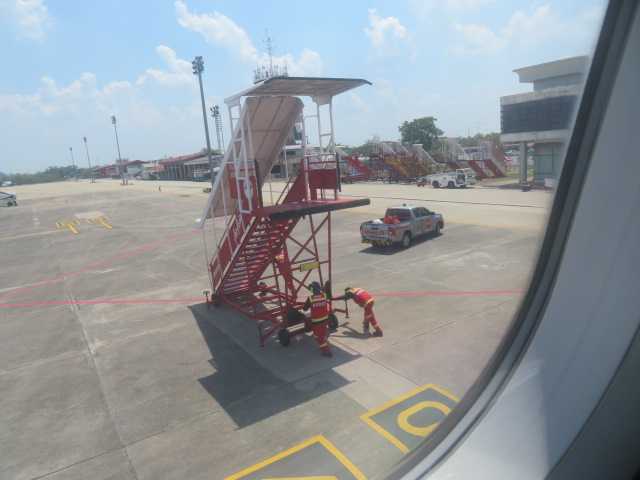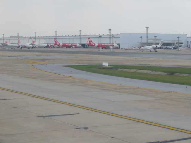 ドンムアン空港に着陸し、駐機場へ向かいます。誘導路から右手に見えるのがターミナル。駐機スポットはどこでしょうかね?バティックエア機が2機。こちらにはモルドバのLCCフライワン。ということは駐機スポットは沖止めか?今は存在しないオリエントタイのB747型機。使われていないTG機です。93番の駐機スポットに入りました。人力でタラップがつけられます。搭乗機にタラップがつけられました。タラップの向こうには着陸しようとしているエアアジア機とこれから滑走路に向かうエアアジア機が見えます。降機して連絡バスに向かいます。バスに乗る前に振り返って搭乗機を一枚。ターミナルの国内線到着口に到着。手荷物の受取場。