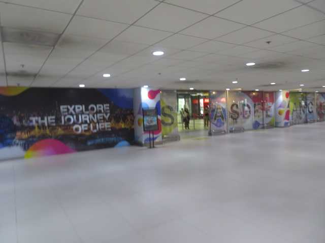 MRTのタオプーン駅。ここからパープルラインに乗り換えます。パープルライン乗り換えは右手に進みます。パープルラインのノンタブリシビックセンターに到着。ピンクラインのノンタブリシビックセンター駅へ向かいます。鮮やかな色の案内板がありますから間違えないと思います。1Bの出口からピンクラインにつながっているようです。大きな荷物のある人はエレベーターもあります。この時の時間は3時前でした。連絡通路にやってきました。