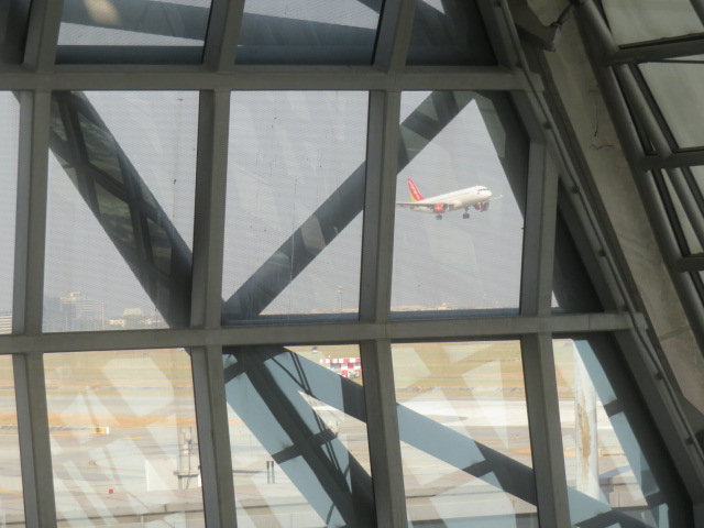 Bコンコースからは滑走路が見えます。ベトジェット機がやってきました。ベトジェット機が着陸します。いま後輪が着地しました。ここはBコンコースの一番端です。コンコースの中に迷い込んだスズメがいます。このスズメはこの後外に出られるのでしょうか?また一機下りてきました。TG機ですね。高度を下げ間もなく着陸。やや前方の機首を上げ着陸です。