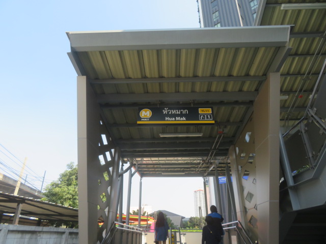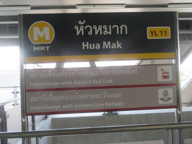 タイ気象局は、今日15日から雨期に入ったことを発表しました。MRTイエローラインのフアマークに到着です。ここでエアポートレールリンクと乗り換えです。乗ってきた列車を見送ります。そして改札口へ。エアポートレールリンクとの乗り継ぎは1番4番出口方向へ。案内板に従って歩いていきます。こうして連絡通路があるので、そのままエアポートレールリンクのフアマーク駅に行けるかと思うのですが・・・。実際はそうじゃありません。それは昨年来た時に体験済み。1番出口を出るとエアポートレールリンクのフアマーク駅へ。4番出口を出るとタイ国鉄のフアマーク駅へと行けるようです。上の案内板だけじゃなく、下にも書かれていました。連絡通路から見るMRTイエローフアマーク駅。踏切を閉鎖して、ちょうどタイ国鉄の貨物列車が通っていきました。その上に見えるのがMRTイエローラインの高架でさらにその向こうにエアポートレールリンクの高架が見えます。遮断機が上がって車が動き出しました。エアポートレールリンクの高架が正面に見えています。