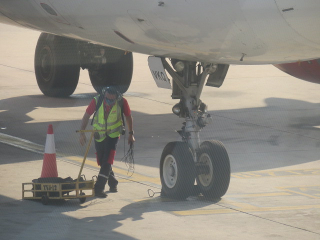 搭乗ゲートに戻りました。搭乗口まではスロープになっています。エミレーツ航空のA380.いつも沖止めでちょっと寂しそう。VZ202はを表示した紙。中国南方航空がプッシュバックされていきます。そこへ滑走路に向かうANA機が通過。見慣れない尾翼デザインの機体ですが・・・。渦を巻く炎のようなデザインのこの機体。カンボジア航空のようです。そうこうしているうちに搭乗機がやってきました。B4ゲートに向かって進んできています。