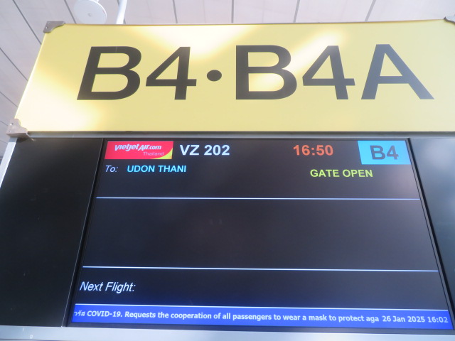 今日から5月です。日本ではゴールデンウイークの真っ最中ですね。北海道は雪が降ったと聞きました。今日はタイも祝日です。1月の春節前に再びバンコクに行ってきました。仕事が終わってから大急ぎでウドンタニ―国際空港に。チェックインは済ませてあるのでそのまま保安検査場を通過。搭乗機はまだ来ていません。ベトジェットVZ203でスワンナプームへ飛びます。搭乗機がやってきました。30分以上遅れています。やはり夜の便はその前までの遅延が積み重なって遅れてしまう可能性が高いのでしょうかね。黄色の中心線を少しずれているようです。機体は停止してボーディングブリッジがつけられます。しばらくして搭乗開始の案内です。