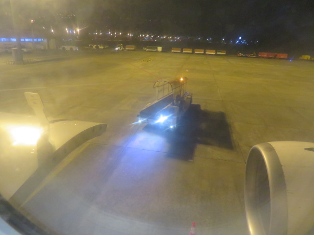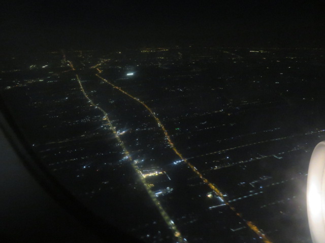 荷物を積み込むベルトローダー車。積み込みが終わりました。搭乗機はプッシュバックされて滑走路へ向かいます。滑走開始です。この日はいつもと違って南東から北西に向かって離陸しました。いつもと見える景色が違うのに、夜なのでよくわからなかったのが残念。乾季には滑走路のこの運用が増えます。眼下には通称リングロード環状線が見えます。さらに上昇を続けます。街の灯りがところどころにポツンポツンと。