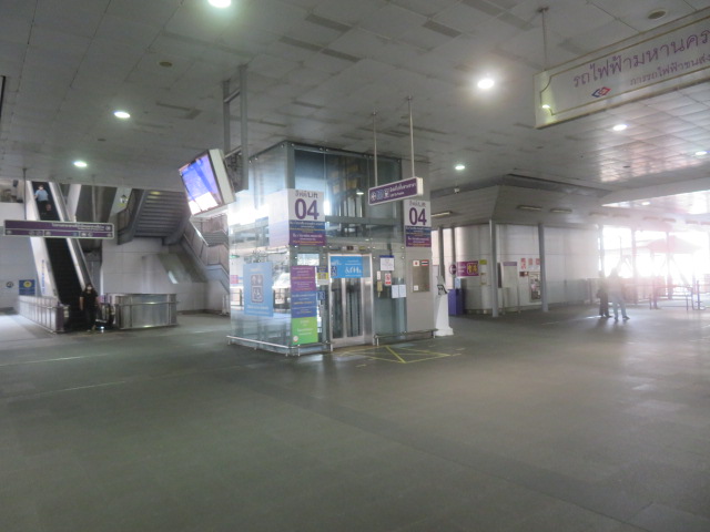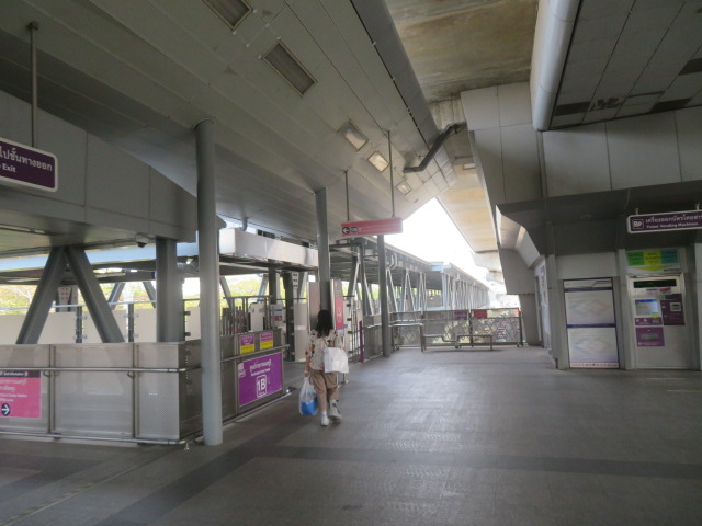 翌日日の出を迎えたバンコクの朝。でもなんだかくっきりと見えないこの空。どうやらPM2.5の影響のようです。日の出を迎えたその空の上方に半分になったお月様が見えます。まだ早いんで、もうひと眠りしましょうか。というわけで、再び目が覚めてのこのこ起きてシャワーを浴びました。実はこの日、PM2.5が危険レベルにまであがっているということで、タイ政府は個人での車での移動を抑制するため、ARLエアポートレールリンクをのぞいたすべての公共交通機関を無料にするという措置をとりました。そんなわけで、この日はBTSとMRTを乗りまくろうとまずやって来たのはMRTスクンビット駅。やって来たのはMRTのタオプーン駅。ここでMRTのパープルラインに乗り換えます。パープルラインでモノレールピンクラインとの乗り継ぎ駅ノンタブリシビックセンターへ向かいます。MRTのパープルラインは、の本の円借款と技術協力によって2016年に開通しました。