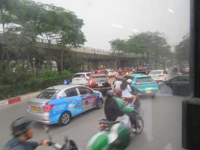 ハノイの市内へ行くバスを探します。新しい建物ができたようで昨年来た時とちょっと変わっています。タクシーが並んでいます。バスプールは確かこちら側に。90番バスがありました。これに乗ってカトリン駅まで行けます。バスに乗りました。料金は15000ドン。バスの車内はこんな感じです。バスはノイバイ空港国際線ターミナルを出発。国内線ターミナルに寄ってから市内へ向かいます。管制塔が見えます。空港を出て高速道路へ。ハノイ市内へ向けて出発しました。ソンホン川を渡ります。橋を渡ってハノイ市内へ。
