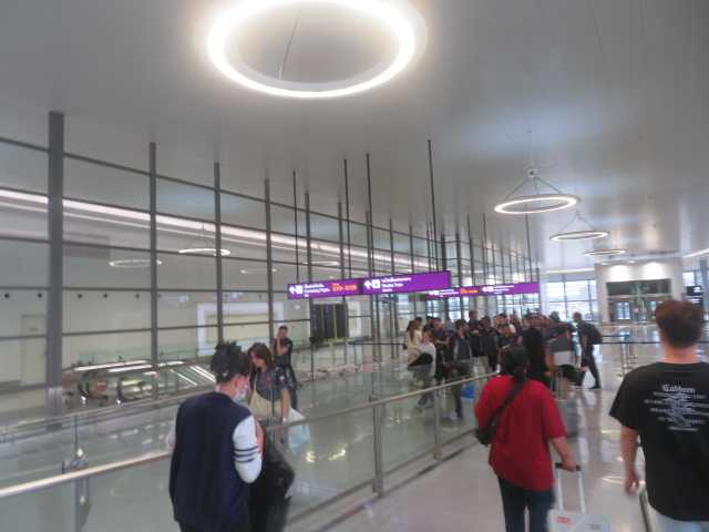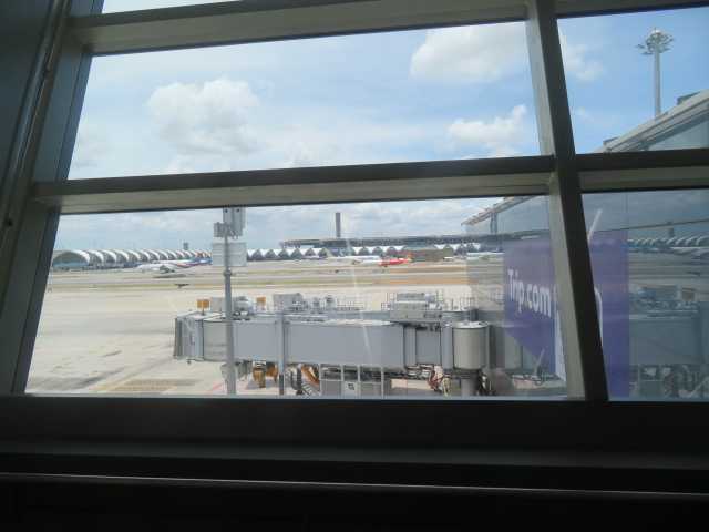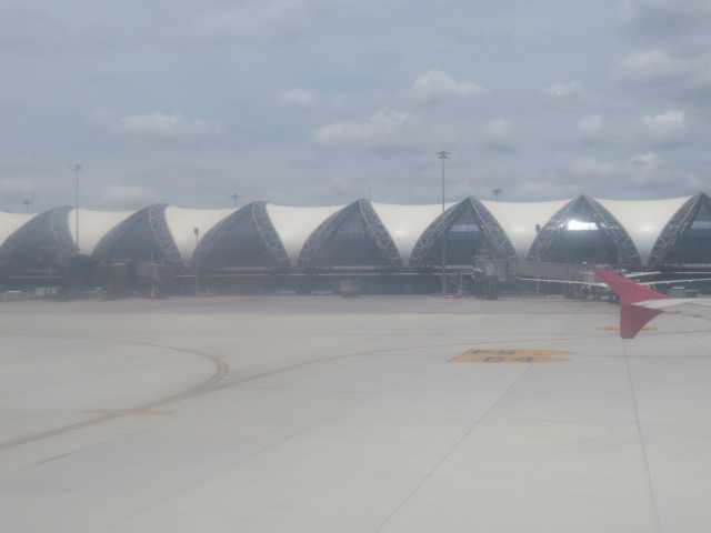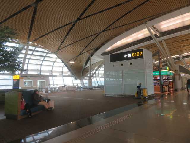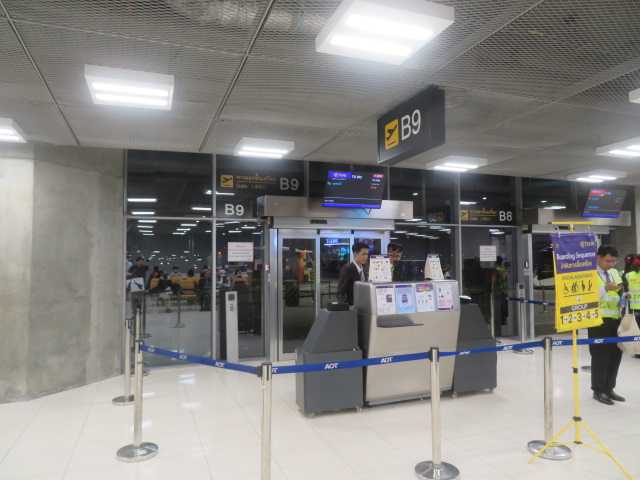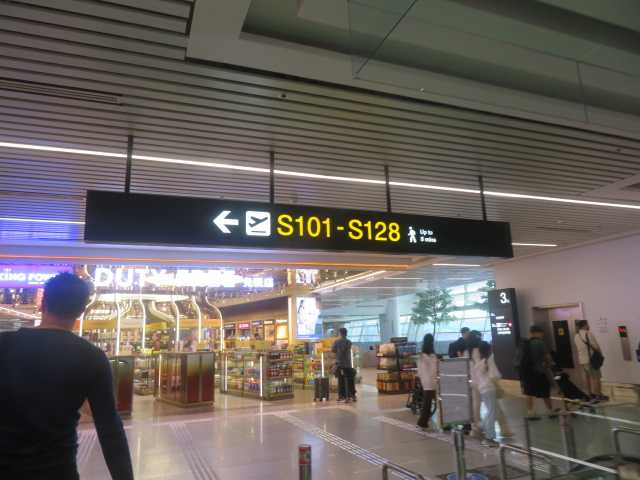 ベトジェットVN201スワンナプーム国際空港に到着しました。駐機スポットへ向かっています。B6スポットに入りました。降機して再びチェックインカウンターへ向かいます。バゲージクレームのフロアを出ます。そして4階のチェックインカウンターへ。既にウエブチェックインすませてあるのでここでボーディングパスを受け取りました。国際線の出発ゲートに向かいます。国際線の出発ゲートはここからエスカレーターでさらに上へ上がります。出国審査を終えて出発ロビーへ。ゲートはS122。サテライトターミナルからの出発です。初めてサテライトターミナルに行くことができます。