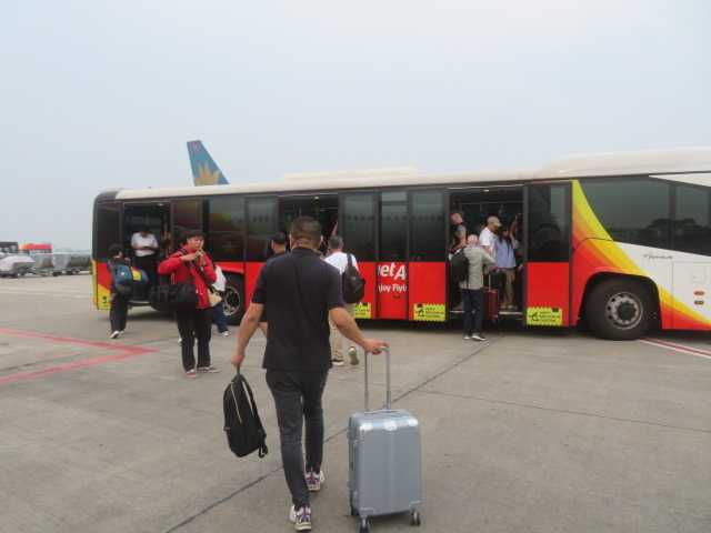 4月はタイ正月のソンクラーン。ソンクラーンといえば水かけ祭り。そんな水かけ祭りから逃れるために、今年のソンクラーンはベトナムへ避難しました。バイクでやって来たウドンタニ―国際空港。ずっと閉鎖されていた駐輪場が再開されていました。この日はベトジェット利用なのでターミナルA。ウドンタニ―国際空港ターミナル。1番の入り口からターミナルへ。ターミナルAを利用しているのは右からTGタイ国際航空、真ん中にノックエア、そして左にタイベトジェット。こちらがベトジェットのチェックインカウンター。チェックインは済ませてあり、荷物はないのでそのまま2階の保安検査場へ。保安検査場を通過して搭乗待合室へ。タイベトジェットVZ201はバンコクスワンナプーム空港行。搭乗機はまだ来ていません。搭乗機がやってきました。前輪が黄色の線をまたいで直進してきます。そして所定の位置で停止。エンジンが停止するとすぐに整備スタッフがやってきます。貨物ドアが開き、ボーディングブリッジがつけられます。超プライオリティーサービスです。このスーツケース2つだけ最初に人力で運ばれていきました。続いてベルトローダーがつけられて荷物が下ろされます。おろされた荷物はターミナルへ運ばれていきます。