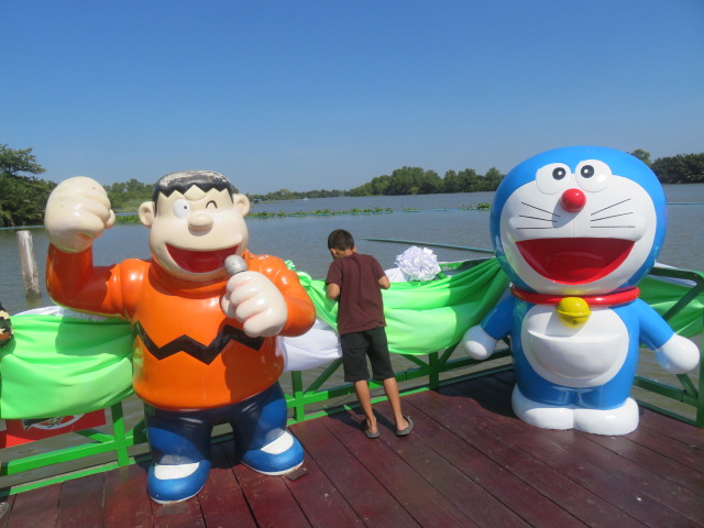 池に浮かぶ蓮の島へ行ってみました。いきなり現れたのはスネ夫君。