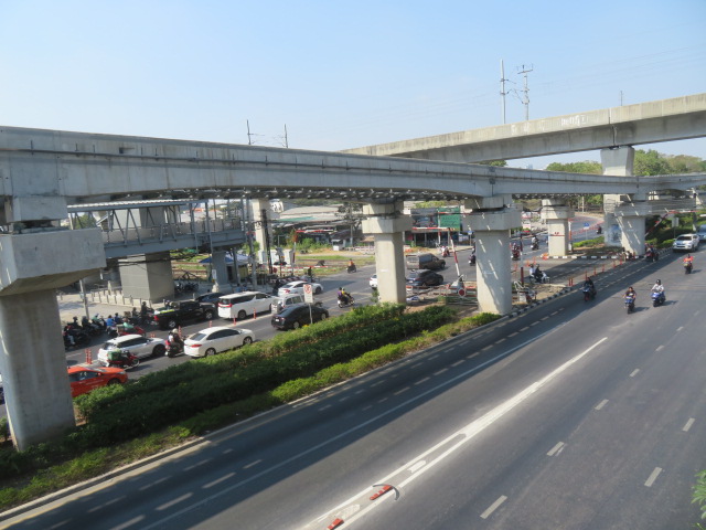 踏切を閉鎖して、ちょうどタイ国鉄の貨物列車が通っていきました。その上に見えるのがMRTイエローラインの高架でさらにその向こうにエアポートレールリンクの高架が見えます。