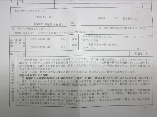 皆様、暑中お見舞い申し上げます。 とある複合施設の地下にある憩いのスペースガラケーで撮った時は涼しげに感じたが、いざ、ブログにアップしたらそうでもなかった(汗)梅雨が明けない北部九州。今日は、久しぶりに晴れました。熱中症警報が出て、暑くなりましたが、体にまとわりつくような暑さには至らず。このまま梅雨が明けるか?しかし、週末に台風12号が来るのでどうなることやら台風や梅雨よ、いい加減にしろ~。 ネタが無いので、どうでもいい話。その1 北九州市民球場(7月22日勤務中撮影)7月20日(海の日)に年に2回しかない福岡ソフトバンクホークスの試合が雨によるグラウンド悪条件の為、試合中止になった。開始時間を30分繰り下げのアナウンス時には、すでに観客席は満席状態。その後、中止のアナウンス。怒号が飛び交ったらしい。その二日後に仕事で近所に来たついでに撮影。やけに寂しく感じた。ネタが無いので、どうでもいい話。その2路上でお金を拾ったので交番に届けた。この写真はA4の下半分。上には拾った日時場所、私の現住所、拾った物の内容などノートPCに打ち込んでプリントアウト。お金が欲しけりゃ小倉北署に取りに来い、の書類。ここで問題1・交番に届けて、どの位の期間が過ぎたら私が貰えるのか?(写真に写ってるけど計算しないように)2・持ち主が現れなくても、お金は要らないよ~と私が受け取り拒否したらお金はどこに行くのでしょうか?答えは最後に。おまけ。NHKのEテレで為になる?情報。日本酒の酒税、1リットル当たり140円。単純計算で、一升瓶で252円が酒税。日本酒の値段に関係無く、1リッター当たり一律140円。知ってました?酒の値段に酒税が組み込まれてたら更に消費税が上乗せ。だったらガソリン税と同じか?それでは答えです。1・三か月を経過して持ち主が現れなかったら貰えます。2・国庫(国の財源)になってしまいます。一番は落とし主の手に戻る事だけど、交番で「落とし主は出て来ないと思う」と言われた。なので、もし、今回受け取ったら、何処かに寄付か募金を考えてます。どうなる事やら?