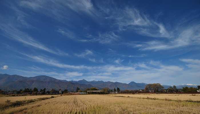 秋晴れの空に浮かぶ雲、北西からの冷たい季節風が吹き始めました南部公園の紅葉日中の日…