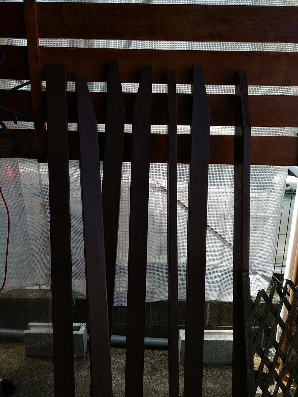 赤松材料 購入 とりあえずホームセンターで 理想の長さに✂️ 塗料を塗り 頑張って 塗装です💀 組み合わせて、何とか 張り付け 終了😁