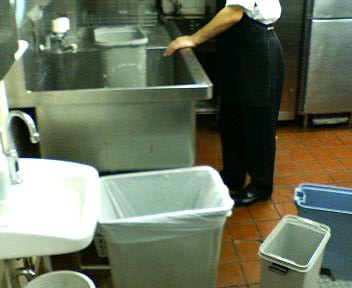 ・・・のその後の経過。えっと。厨房の床を掃除をするために、24時間のうちの20分だけシンクを集中的に使わせてくれという俺のお願いを無視・・・どころか、このように(↓) 急ぐ必要の無い洗い物を引っ張り出してきて邪魔をするA住さん。それに対して、どうあってもどうせ無駄な時間がかかると言う事で、厨房裏にあるモップシンクでゴミバケツにお湯を溜めるようにしていた。(↓) それに対して、A住さんはどういう嫌がらせを返してくるかと思っていたら、前回は通せんぼというオコチャマチックな手で来たのでちょいと拍子抜け。アレから実質7日経って、そろそろ良い(俺にとっては悪い)嫌がらせを考えただろうと、俺としてもちょっと嫌味な期待をしていたら、やっぱり考えていたらしい(笑)。今回ぶつけてきた嫌がらせは、大声でアピール!!『おおぃ!! お湯がデネェよ~! そっちでやってると、 こっちが仕事になんねぇよ~』前回・前々回と、普通に仕事をしていたはずなのに、今日に限っていきなりお湯が出なくなり、仕事が出来なくなったらしい。まぁ、壁を挟んで表と裏で同じ湯沸かし器を同時に使ってるんだから、湯出量は減るわな。でも、それでも、とりあえず無視してみました。どんなアピールをしてくるかと思って。それと、ムカついて手を出しちゃったらまずいので。すると、他の社員やクルー(バイト)に一しきりアピールした後、裏に回ってきて叫びます。いや、叫ぶと言うほどじゃないな。声を張り上げて抗議、と言う方が正しいか。『オイ!そっち(裏)で使ってると、 こっち(厨房)が使えねぇんだよ!! 後にしてくれよ!!』はい、当時AM3時13分。3時から厨房作業に入るはずのところを、13分ほど待った上でお湯を溜めてますが?お湯を溜めると言う作業は、未だ準備段階であって、さらに遅れて作業に入るということで、十分すぎるくらいに、君たちに譲歩していますが?さらに、他のクルー連中に対してアピール。『いや、裏で使ってるからお湯が でねぇんだよ。 言ってんのに、 いう事きかねぇんだよ!!』・・・あなたの言う事を聞かなくてはいけない理由は?俺はあなたの部下でもないし、そもそも、あなたの嫌がらせに譲歩する形で裏のシンクを使ってるんですけど?俺が3時から厨房の掃除を始めたいのは、時間の問題。厨房の掃除には、最低で1時間掛かる。それも、厨房内の床掃除のみに限った時間で、厨房裏の床も掃除しているし、その間に納入されるバンズ(パン)の日付ごとの整理も含めれば、基本的に2時間掛かる作業になる。普通にやれば、3時に始めても5時までの作業だ。けれど、5時からは『モーニングメニュー』が始まるし、その時間以前にクルーは準備を始める。となれば、4時30分には終わらせなければいけない。しかし、その『モーニングメニュー』の準備は、バンズ(パン)のセッティングも含む。と言う事は、バンズ(パン)の整理を4時30分には終わらせなければいけないという事で、床清掃は、その15分前には終わらせなければいけない。となれば、厨房床の掃除は3時から始めても、その前20分くらいで厨房裏の掃除を終わらせる必要がある。ここで問題なのは、3時近辺というのはクルーの入れ替えのタイミングと重なると言う事だ。それまで5・6人で働いていたところを、2・3人に減らすスケジュールとなる。実質の客数がそれで対応できる程度だから、それ自体は問題は無い。が、人数がいるうちに作業を終わらせておこうという意識が無いのが、問題なのだ。来客が無いと、20分でも30分でも平気でおしゃべりをしている。それで、3時の入れ替えでお喋りをする相手がいなくなると、いきなり作業を始めて、俺の厨房掃除とぶつかるのだ。先にシンクを使うような洗い物をしておいてくれればトラブルは発生しないはず(ハズ)なのに、そんな熱心な事はしない。そこで発生するトラブルは、全て俺の責任だ。実際問題として、客数と作業の問題はルーティン化できるものでもないから、仕方ない場合も多々有ることは認める。だから、俺は6年間も嫌がらせを我慢していると言う経緯もある。が、だ。クルーや社員のジャマにならないように、可能な限り効率的に作業を組み立てても、バケツにお湯が溜まる時間までは俺がコントロール出来るものではない。モップをかけた床が乾く時間も、エアコンの電気代を節約しようと思ったら、それなりに掛かる。レギュラーメニューの対応をしながら、『モーニングメニュー』の準備もしなければいけない4時30分を過ぎて、俺たちメンテナンスクルーが作業をしていたら、邪魔になる。そうならない為には、俺たちの作業開始時間がシビアになるのは当然だ。だから、24時間のうちのたった20分だけ協力してくれと言うのが、そんなに理不尽だろうか?ちなみに、彼らの言う『あとで』と言う時間に相当する時間と言うのは、彼らの作業を見ていると4時過ぎになるらしい。それまで、頻繁に洗い物をしていたからね。逆に、厨房床の掃除にお湯を使う