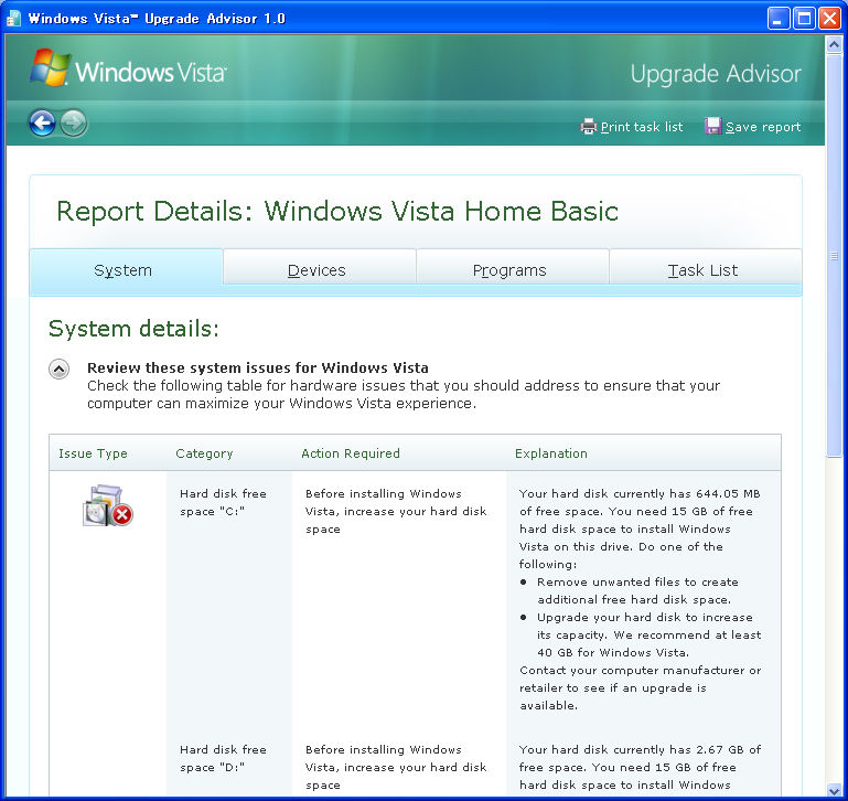 ”Windows Vista”発売まで2週間となりました。これ自体あまり興味はないのですが自宅パソコンリプレースの口実にしたいと。。。嫁さん対策です。購入して4年近くなるのでそろそろ、良いかな~ディスクの回転音が大きくなってきたので、やばいような感じですし。子供達への払い下げとなるので、ちょっと適応度を調べてみました。MSサイトからVistaへの適応度を調べるプログラムがダウンロードできるます。ダウンロードはココ (英語版だけです。)結果はこれ(HomeBasic)HomeBasicだと大きな問題はなさそうです。ディスクが小さいのでクリーンインストールとなるでしょうが。。。やはりUltimateとなるとビデオ関連が問題となりますね。やっちゃおうかな~Windows Vista Home Basic アップグレード