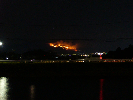 久しぶり?始めて?のローカルネタです。奈良の若草山で毎年行われている『山焼き』という行事です。こんなホームページもあるようです。バクダン低気圧のおかげで延期となったのですが、今日行われました。現地に行ったわけではなく、自宅近所から見ていたのですが寒かったのですぐに帰ってきてしまいました。ここでちょっとウンチクを『山焼きは江戸時代、東大寺と興福寺の領地争いを仲裁するため、奈良奉行が山を焼き境界をあいまいにしたのが始まり』だそうです。