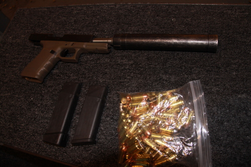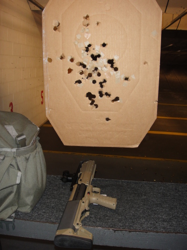 私のGlock21とKenのFNピストルにサプレッサーをつけて25m先のターゲットを撃ってみました。心持ち、下に当たる感じです。今日使ったアイアンサイトはサプレッサー用では無かったので、ターゲットがサプレッサーでちょっと隠れてしまいます。次はハイサイトに付け替えます。KenのFNに同じサプレッサーをつけてレッドドットで撃ったらKenも私も4時の方向に着弾しました。Glockだと、大体真ん中に当たりました。