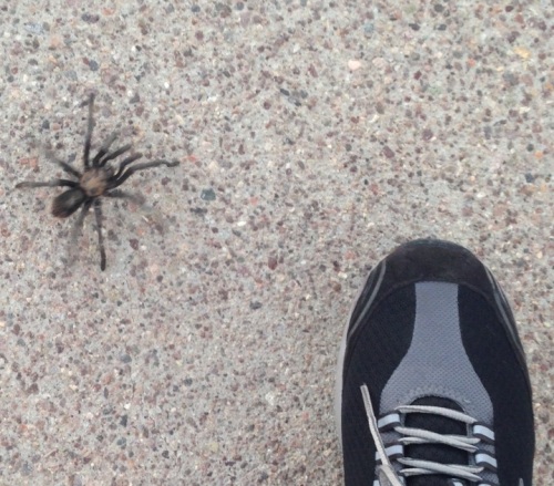While I was jogging at park, skinny guy wore skull mask & bone printed clothe walk towards to me. Then I realized he holds huge rock in his right hand.If he throws rock at me, it'll break my skull & knock me out. Yes, it is 2 weeks before Halloween, some folks could be inpatient to wait for trick or treat?However, I heard from my Police student that he arrested person throwing huge rocks at his neighbor's home the other day.So, I kept my eyes on him and made smile when I passed his left side.Nothing happened, but I was keep listening his foot steps carefully in case he turns around and throw big rock at me. After I made enough distance, I called Ken and told him about that person.Ken said, "Avoid first attack then you can kick his ass.""yeah...he's still standing around tree, so I'll use different route to back home" On the way back home, I Found a huge spider on the ground, which scares you more?Human or bug?公園をジョギングしていたら、スカルマスクにスケルトンのパーカーを着て、フードを被った人物が前から歩いてきました。ハロウィンが待ちきれない人かと思いましたが、右手には大きな石を持っています。投げられたりぶん殴られたりしたら、頭蓋骨陥没間違い無しの大物です。以前ブログにも書きましたが、警察官やってる生徒が近所の家に大きな石を投げて穴をあけまくってる男を逮捕した話を聞いていたので、やーな感じです。日本では考えられないほど麻薬中毒者やおかしな人がいるベガスですからね。相手に視線をすえたまま、形だけは笑顔を作ってすれ違いましたが、その後も石を投げる為に振りかぶる音が聞こえないか注意しました。拳に電話して、こんなヤツが居るんだけど、帰りは道を変えるけど、もし帰ってこなかったらやられたと思っってと言ったら、最初の攻撃さえ避ければぶちのめせるだろうと返事が返ってきました。普通なら、、、迎えに行こうかとか、、、まあ、いいんだけどね。取りあえず、メールとソーシャルメディアをオンにして、歩きながら何人かに状況を送り、家に着いてから着いたよー、の連絡を入れました。アメリカ人は即効で大丈夫?と家に着く前から何度も確認してきて、無事で良かったね、返事をくれましたが、日本の知り合いは Ki Do Ku Mu Shi! (ヨッシーさんの真似)そうそう、帰り際にまた大きな蜘蛛をみかけたので一緒に記念写真を撮りました。普通ならおかしな人物に遭遇と大蜘蛛にばったりで、もう公園なんか行かない!とトラウマになる人もいるかもしれませんが、私はこんなんやってる段階で大丈夫でしょう。