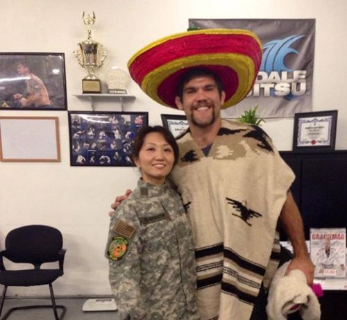 この日はハロウィンだったのでこの格好です。前にコブラ会で練習していた時は、No Giだったので昇級審査関係無しでしたが、ドライズデール柔術で白帯のGiクラスに出始めたら何で白帯クラスで皆をスマッシュしてるんだ、次の昇級審査受けろと言われました。だって、Gi柔術は多分合計10回位しかクラスに出たことが無い、本当に白帯だもん、、、。それでも柔術しかしたことが無いリアル白帯とは相手にかけるプレッシャーも技を覚えるスピードも違うそうで、拳と私は黒帯、茶帯に揉まれてスパーする方が速く上達するから色帯クラスに移った方が良いとの事です。確かに、コブラ会でスパーしてたのはジェフ・グロバー、シンプソン・ゴー、サニー・ノハラと黒帯茶帯のチャンピオンばかりだったので、他の人達よりかなり恵まれていました。キックとパンチとエルボーか、銃を教えるかわりに柔術プライベートレッスンというわらしべ長者方式。普通だったらものすごいプライベートレッスン料金が(お互い)かかります。ドライズデールは拳の指導するプロクラスにも出ますが、白帯レベルのムエタイクラスにも、自分が柔術を教えている生徒に混じって参加しています。普通の道場主、なおかつ他のマーシャルアーツのチャンピオンが白帯の気持ちを持つことは、なかなか出来ることではありません。拳や私は習い事が大好きなので、ナイフも柔術も初心者クラスで基本からやる事に全く抵抗がありません。ドライズデール柔術には黒帯は、練習を続けた白帯のことといった感じの標語があり、トップ自ら実践しているのでいい環境です。